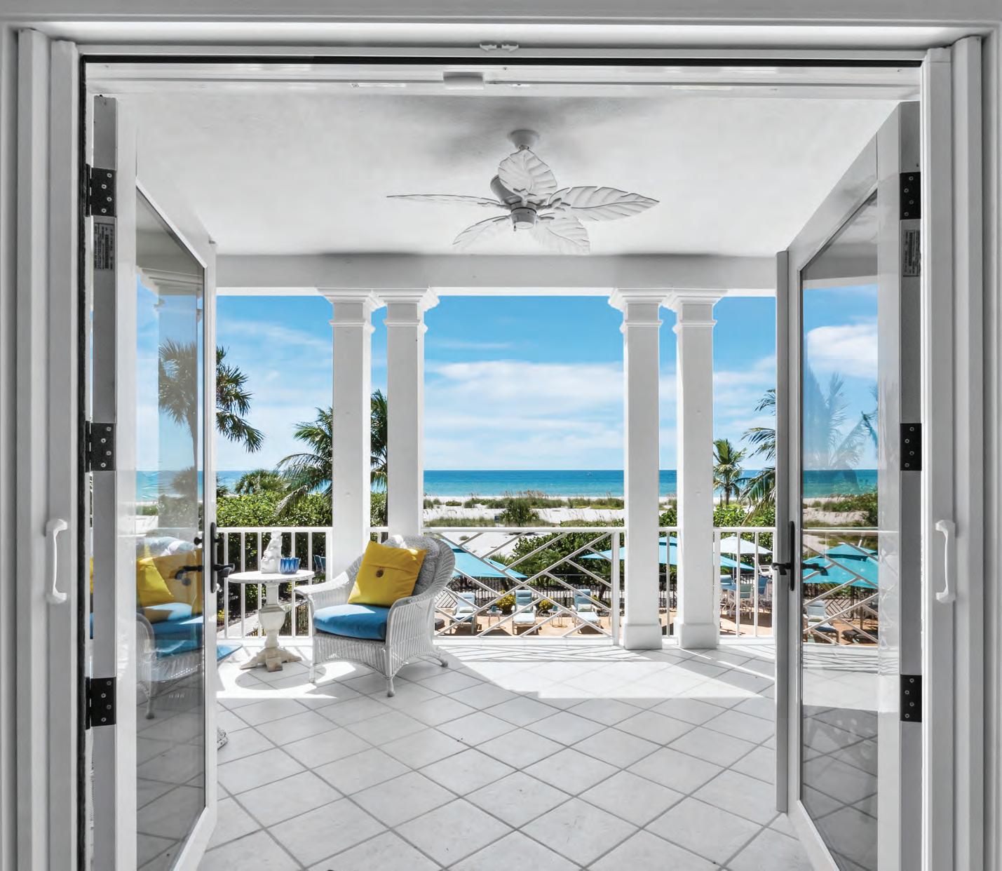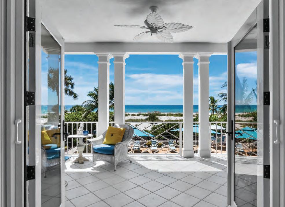 Architect Scholz’s homes are famous for their perfect proportions, and you sense this immediately in the living room, an 18-by-22-foot space with travertine marble floors and a crystal chandelier. Three large windows (the center window is also a door) open onto a spacious terrace. Classical pillars frame the wide expanse of sand and water, making it one with the architecture.