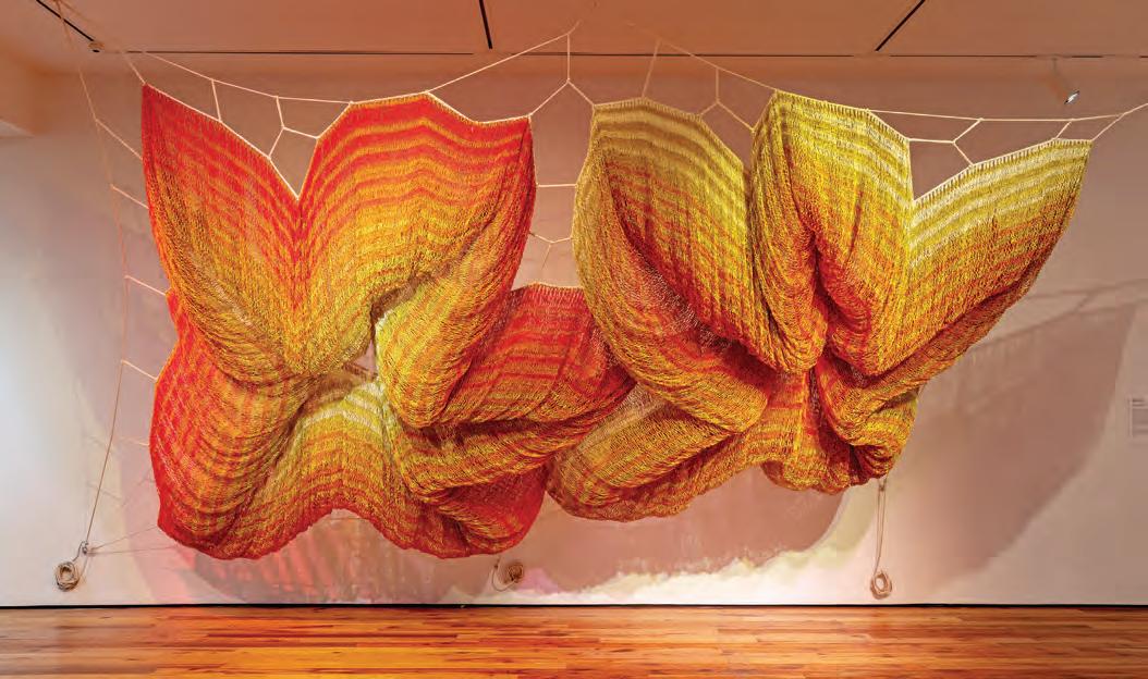 Sarasota Art Museum’s “Janet Echelman: Radical Softness” is a sweeping retrospective of the celebrated artist’s four-decade career. Her recent work includes massive, outdoor net sculptures like “Butterfly Rest Stop” and “Remember the Future.” These floating, multicolored webs seem to sculpt the sky. The artist’s latest series of cyanotypes is also on display. Created from 3D digital models and photos of Echelman’s installations, these prints translate her massive, netted forms into evanescent imagery. This show also traces the artist’s first steps in paintings, intimate textile works and sculptural studies.