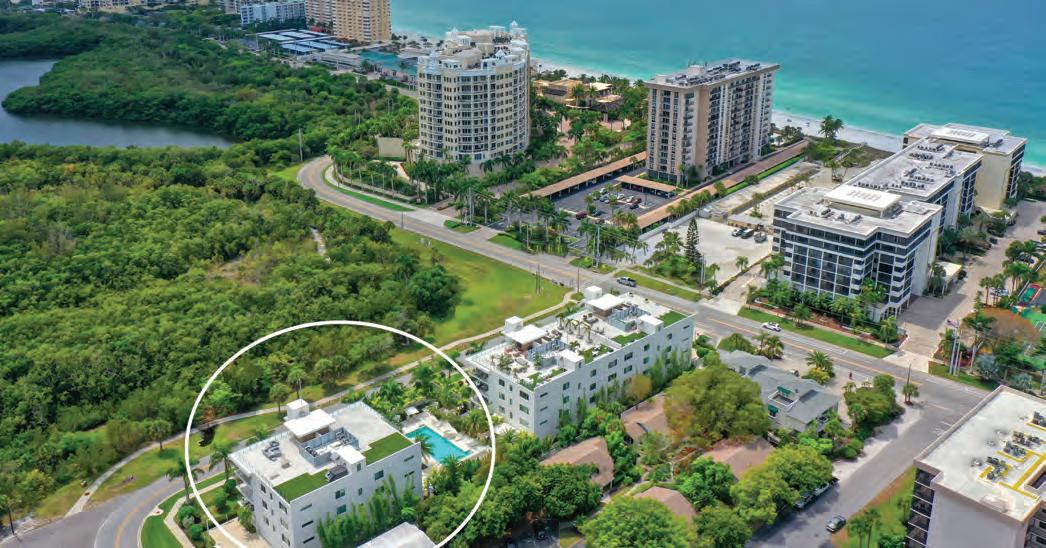 PLUS a 2,250 sq ft Private Rooftop Terrace with wrap-around views. Directly across from the Gulf of Mexico and features a resort-style heated swimming pool and spa, two under-building parking spaces with an additional storage room, and is overlooking the 110acre waterfront south Lido Park Reserve.