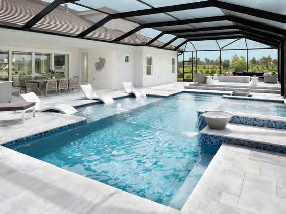 flows through the home, uniting each space into a harmonious whole. Each guest bedroom has its own bath, appointed with Calacatta quartz and opulent porcelain tile. Most impressive is the all-important primary bedroom and bath. Located in its own wing, the luxurious retreat overlooks the pool and backyard. Sliding glass doors disappear, and an intimate seating area provides a great spot for reading. The bath has a new life of its own. Marble floors and marble niches give it an upto-date elegance, and the sprawling walk-in shower (there’s also a soaking tub) has multiple showerheads, both rain and handheld. There’s even a special one to bathe the dogs.