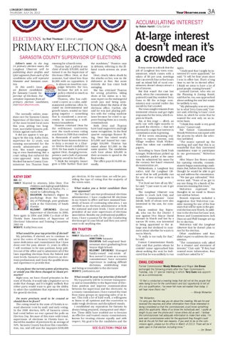 Editor’s note: As the Aug. running for a fourth term. 14 primary election nears, the Thaxton had a political war Longboat Observer will be chest of nearly $70,000, and he publishing short profiles and turned it on the Supervisor of Q&A segments from each of the Elections Office. Dent, at that candidates who will represent moment, had raised less than Manatee and Sarasota coun- $2,000 with no opposition. It ties. is almost an issueless cam2012 paign between the two, In this week’s issue, PRIMARY because the job is not we feature candidates ELECTION for Sarasota County Supolicy-related so much as pervisor of Elections. For ministerial. complete responses from all Thaxton, who has cultiprimary election candidates, vated a career as a calm, mildvisit YourObserver.com. mannered politician often focused on environmental and ... growth issues, wasted no time The normally sedate, mun- going negative — something dane race for Sarasota County that is considered a near-neSupervisor of Elections is one cessity in unseating a wellof the most heated local races known incumbent. Thaxton criticized Dent for this year, pitting two longtime, successful Sarasota poli- the well-known controversy over the touch-screen voting ticians against each other. It did not appear it was go- machines in 2006 that resulted ing to be this way. Kathy Dent, in thousands of under votes, supervisor for 12 years, was and her lesser-known decision running uncontested for the to deny a recount to a Charmostly administrative posi- ter Review Board candidate in tion. She wasn’t campaign- 2010. He has made it personal ing or even fundraising. But a against Dent, charging incomcourt ruling that enforced the petence and a lack of personal voter-approved term limits integrity overall in her office. “I think the integrity (issue) blocked Sarasota County Commissioner Jon Thaxton from goes a little further than just