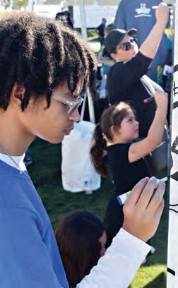 Jaden Stotz, 16, adds to a piece of community artwork alongside Piper BorgiaHoward, 7, and Kelly Borgia of Gulf Coast Community Foundation.