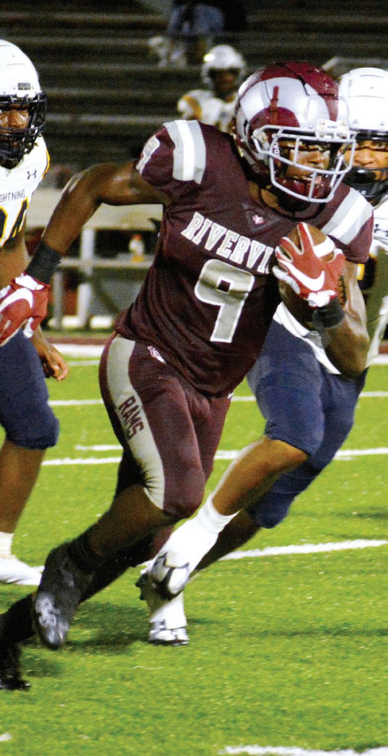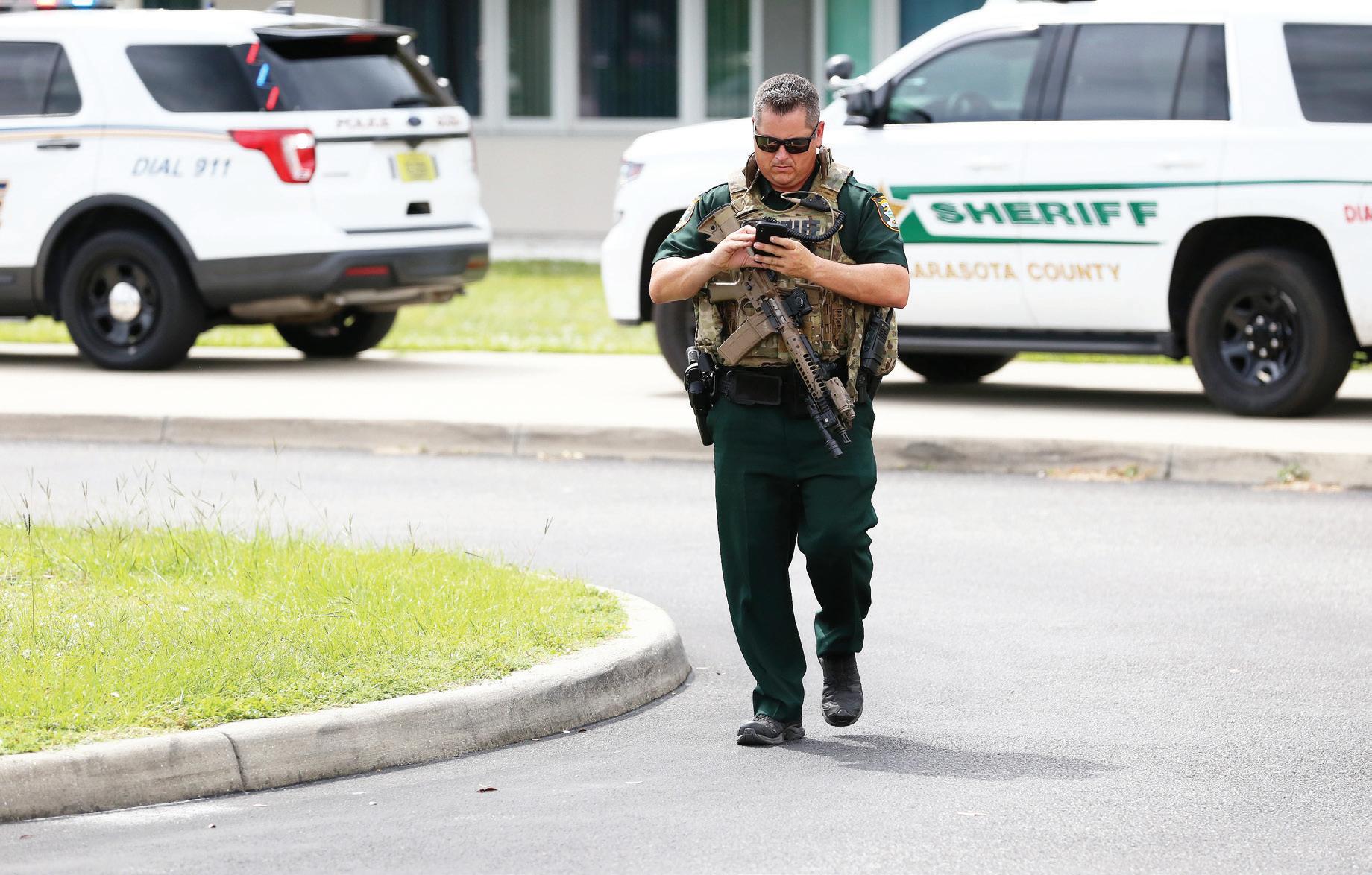 A deputy armed with a rifle walks away from the front of Riverview High on Tuesday.
