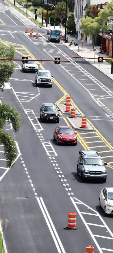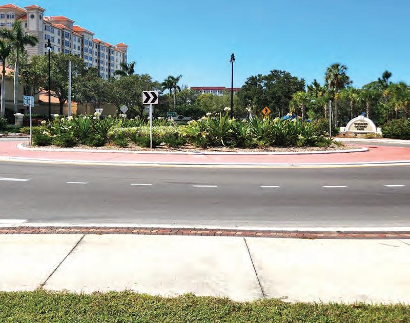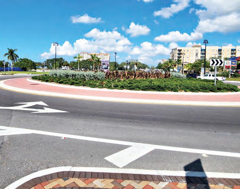 The roundabouts along U.S. 41 are in part a product of the new urbanist Andres Duany-inspired downtown master plan, which called for signifi cantly reducing speeds on Tamiami Trail by moving buildings closer to the road to create “enclosure,” which naturally encourages slower speeds, and installing traffic-calming fea tures — such as roundabouts — to create a more walkable community.