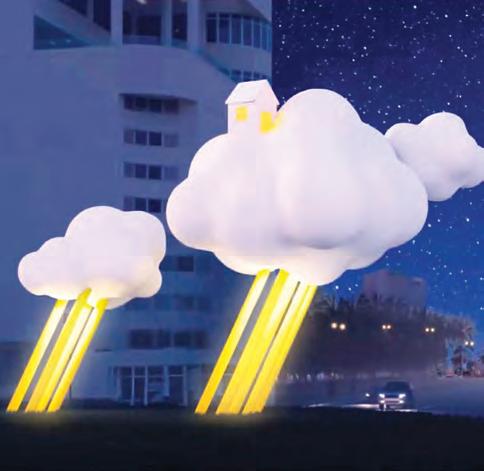 sturdiness of the pieces against hurricane force winds, particularly Sheng’s piece, Dancing Clouds, made of colorful architectural glass mounted atop steel poles at a variety of heights; and Lim’s Sun Always Shines, two translucent clouds mounted by sunray-evoking supports, one with a tiny house mounted on top.