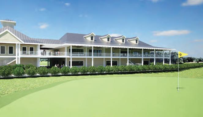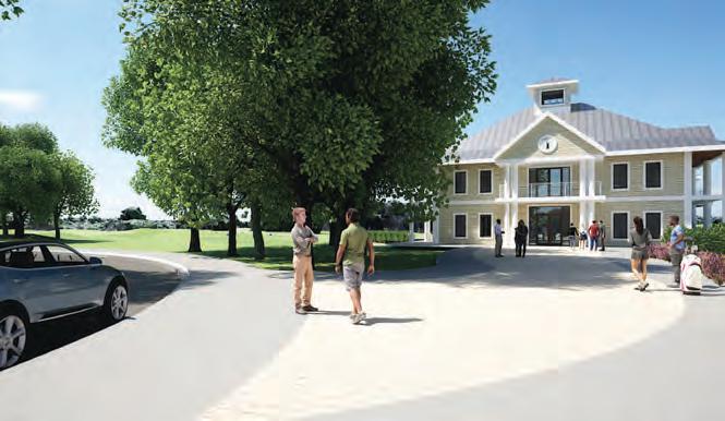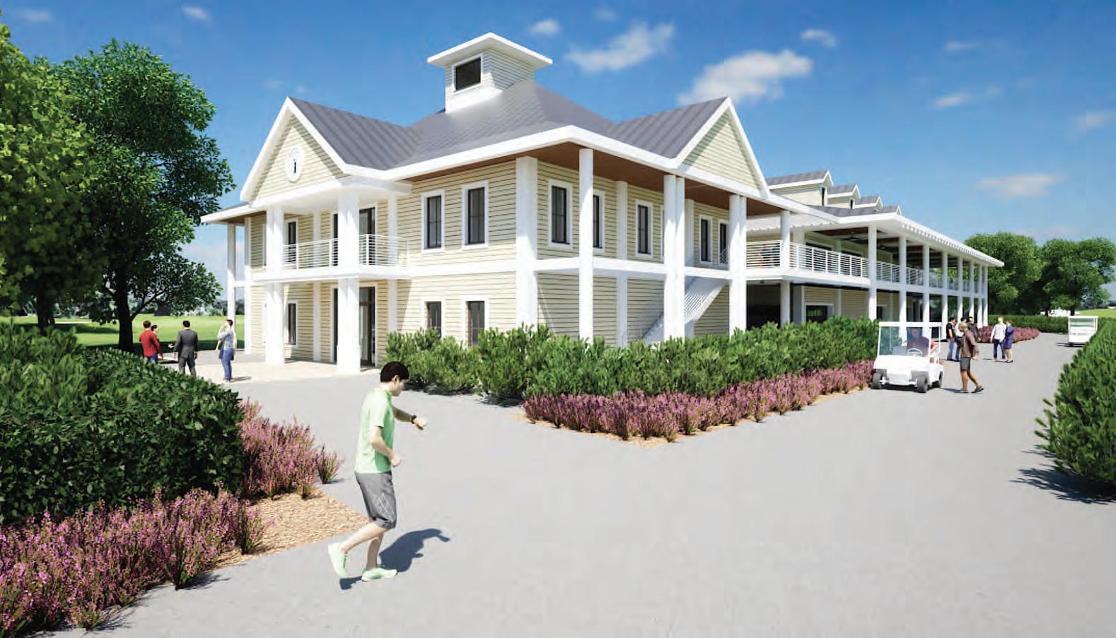 The proposed two-story Bobby Jones Golf Club clubhouse as viewed from the ninth green. The two-story structure’s golf shop and offices would be to the left and the restaurant would be above the cart barn to the right.