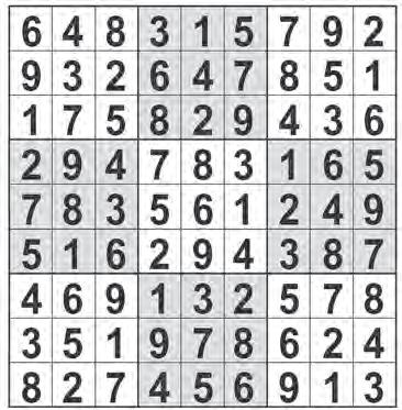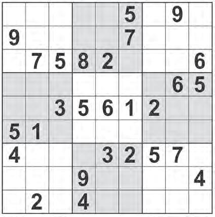 the grid so that every row, column and 3x3 box contains every digit from 1 to 9 inclusively. ©2023 Andrews McMeel Syndicate crossword ©2023 Universal Uclick ACROSS 1 Senor living facilities? 6 “Superfood” seed 10 Hurled 15 Super’s accessory 19 Sniff 20 Pompeii, e.g. 21 ___ couture 22 AXP, on the NYSE 23 Bank of America: “Our savings bonds will ___!” 26 Soprano Te Kanawa 27 Utah ski resort 28 Tigers, on scoreboards 29 Sioux speakers 30 Mixes 32 Minor criticism 33 Reese of “Touched by an Angel” 35 Number at a golf hole 36 Forked over 37 Peloton: “Our equipment withstands ___!” 41 Itty-bitty 42 “Wowza!” 43 Felonious fire 44 Money charged for money (Abbr.) 46 Stimulating substance, briefly 47 Singer DiFranco 48 Potentially offensive (Abbr.) 52 Castle defense 53 French’s: “Our freshness seals are so strong, we guarantee they ___!” 58 Anthem contraction 59 Street speed reducer 61 Charlottesville sch. 62 Become expert in 63 Adrenaline, informally 64 Zoom: “Don’t worry about saying stupid things, because so often, ___!” 69 A free country 70 Muppet who often singes Beaker’s hair 72 “I’ll take that as ___” 73 Soothing plant 74 Squealer 75 Petco: “Buy one of our restraints to give your dog ___!” 80 Nicolas of “Pig” 81 French 101 verb 82 Bio or chem 83 Bigwigs in Vogue? (Abbr.) 84 Weighing devices 86 Appliance brand 89 Warm up for a bout 91 Ecosystem 92 Keurig: “Sick of complicated instructions? ___ and buy our simple machines!” 98 Mediator 99 Narrow inlet 100 Tending to ooze 101 Before, in poetry 103 Frankfurter 104 Jazz musician with an Egyptian-inspired name 106 “We ___ All Completely Beside Ourselves” (PEN/ Faulkner winner) 107 Surrounded by 108 Pixelated Atari game 109 Formica: “Our countertop is so magnificent, people will ___!” 113 Alan of “Marriage Story” 114 Privileged group 115 Rebuke from Caesar 116 Writer Gertrude 117 Rapper Kanye 118 Blood bank VIP 119 Joyful internet cry 120 Speech therapist’s concerns DOWN 1 Channel focused on D.C. 2 Aviator Earhart 3 Baseball pro whose mascot is a moose 4 Seltzer lead-in 5 Sneaky 6 The “C” in ASPCA 7 Move like a meteor 8 Suffix for junior’s junior 9 Years overseas? 10 Coordinated motion at a stadium 11 Zimbabwe’s capital 12 Regrets, big time 13 Sci-fi regulars 14 Amenities for cocktail parties 15 Crumbly breakfast treats 16 Coconut ___ (soy sauce alternative) 17 Chicken hawker Frank 18 Is real, like Santa to some 24 Danish birthplace of Hans Christian Andersen 25 Subject 31 Middle management course? (Abbr.) 33 Take courses? 34 Peace Nobelist Kofi 36 Jewish festival 38 Took off 39 Cake recipe verb 40 Bad reviews 44 One-celled beings 45 Straightforward soccer kick 46 Nightclub in a Manilow song 47 “Stat!” 49 Cats and dogs, supposedly 50 Portend 51 Bank info of interest 53 “Somebody come get this man / I think he got lost in my ___” (Lizzo lyric) 54 Stage, as a play 55 NYC’s Park or Madison 56 “Yeah, I’ll pass” 57 Fill up 59 Actress Jessica 60 ___ Reader 65 When doubled, a Hawaiian fish 66 Hasbro card game 67 Blockheads 68 ___-de-France 71 Insulting profanely 76 “Up” voice actor Ed 77 “The Lion King” villain 78 Fall faller 79 Elba of “Luther” 80 Sleeveless top, for short 84 Coffee taster, at times 85 Senator Booker 87 Speck 88 Warded off 89 More polished 90 Rush drummer Neil 91 Result of too many sixpacks, ironically 92 Tropical fruit tree 93 Baltimore pro 94 Some sink traps 95 Not betraying 96 Not far from 97 Three-sided beef cut 102 Utopias 104 Fruit peel 105 Not many 107 Against 110 Telefono greeting 111 Sioux speaker 112 Subj. at Gallaudet