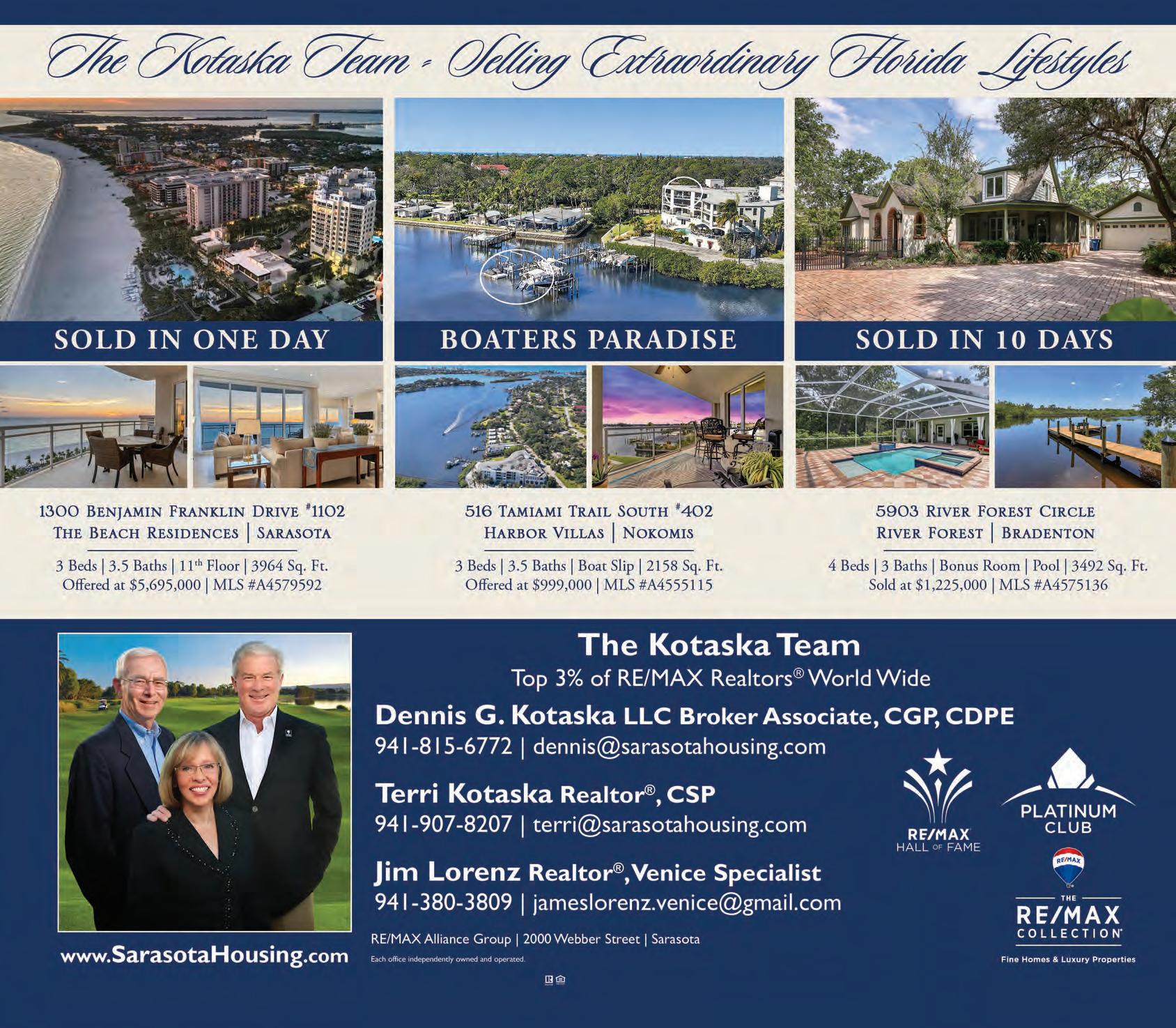 36 SARASOTA OBSERVER | THURSDAY, AUGUST 31, 2023 YourObserver.com Sotheby’s International Realty® and the Sotheby’s International Realty logo are registered service marks used with permission. Each office is independently owned and operated. Equal Housing Opportunity. Property information herein is derived from various sources, including, but not limited to, county records and multiple listing services, and may include approximations. All information is deemed accurate. With expert market knowledge and unparalleled team resources, we can provide the highest level of service throughout the buying and selling process for customers on the barrier islands, mainland neighborhoods, and in the area’s golf course and master-planned communities, including Lakewood Ranch and Palmer Ranch. CONTACT US TODAY! 3909 CASEY KEY ROAD CASEY KEY 1815 NORTH LAKE SHORE DRIVE WEST OF TRAIL 423 SOUTH POLK DRIVE LIDO KEY 3799 FLAMINGO AVENUE SIESTA KEY 128 GOLDEN GATE POINT #601B VISTA BAY POINT $8,600,000 $22,000,000 $2,795,000 $5,895,000 $2,750,000 LUXURY REAL ESTATE DEFINED SCHEMMELSODAGROUP.COM Joel Schemmel, J.D., REALTOR ® Joel.Schemmel@PremierSIR.com 941.587.4894 Toni Schemmel, MBA, REALTOR ® Toni.Schemmel@PremierSIR.com 941.914.0805 To find out more about our recordbreaking luxury sales and how we can work for you, scan the QR code. OVER $129 MILLIO N SOLD AND PENDING IN 2023 OVER $199 MILLIO N SOLD AND PENDING IN 2022 NO. 1 SMALL TEAM by sales volume in Sarasota and Manatee counties NO. 15 Small team by sales volume in Florida 405623-1