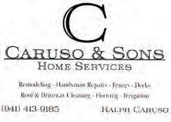 for Rent/Sale 48’X21’ BOAT SLIP P07, at Long Boat Key moorings F FOR SALE! Slip runs north and south, and provides views of Sarasota Bay. Asking $250,000 and will consider respectful offers. Slip does not require membership at the moorings. PH: 941-724-9486 brent@dif ey-wright.com Lost & Found LOST: CROSS NECKLACE! Silver Filigree. Very sentimental meaning. If found please email, lvzamp@gmail.com Or call 201-527-0863 Merchandise Wanted SENIOR LOOKING to purchase precious metals, diamonds, time pieces, coins, jewelry, antique and estate jewelry, and some collectors plates. Personal and confidential. Please call Marc: 941-321-0707 WANTED TO Buy Vintage & Old Costume Jewelry in large amounts. Jane (941) 356-1568 auto Autos Wanted CASH FOR Y YOUR CAR We come to you! Ho Ho Buys cars. 941-270-4400. DESPERATELY NEEDED Low mileage, cars and trucks. Also rare or unusual vehicles. Larry 941-350-7993 STORAGE FACILITY Boat/ RV/ Trailer. Secure facility, low monthly rentals, Clark Rd area. 941-809-3660, 941-809-3662. WE BUY cars top $$ paid for your vehicles Call Hawley Motors: 941-923-3421 Motorcycles OLD MOTORCYCLES WANTED *Before 1985* ALL Makes & ModelsAny Condition! Running or Not! $Cash Paid$ Call 845-389-3239 cyclesndmore10@gmail.com FIND BUYERS & SELLERS HERE! 941-955-4888 YourObserver.com/RedPages real esta te Vacation/ Seasonal Rentals WEEKLY MONTHLY SEASONAL RATES Beachfront, Bayfront and In Between Houses or Condos Reservations 941-383-5577 wagnerlbkrentals@gmail.com Visa/MC 5360 Gulf of Mexico Dr., Suite 101 Longboat Key, FL 34228 Rental of ce 9a.m. - 5p.m. M-F Ask about our special rates! Wagner Realty Since 1939 www.rentalsonlongboat.com hom e serv ice s Adult Care Services (CAREGIVERS) ELDER CARE/COMPANIONSjob is for 5 Days a Week –5 Hours per Day – Salary is $20 per Hour. Clean record, good recommendations, mobile, with many skills For more details about the position, email (holt.j88@yahoo.com) CNA CAREGIVER Experienced & reliable. 20 years experience. Call Sandy 941-387-6176 IN-HOME PERSONAL CARE •Meal Prep •Daily routines •Respiratory Therapy & Hospice Background •Doctor appointments 15+ yrs exp. Exc local ref. Call Robyn: 941-685-7199 Perfect Solutions For Seniors •Caregivers/Companions •Personal Care •CNA’s/HHA’s •Assistance with Daily Living Activities •Hourly 24/7 Care •Affordable Rates •Licensed/ Bonded/ Insured Phone (941) 809-1438 HHA# 299994819 PERSONAL CARE GIVERPrivate care: Meal preparation, errands, shopping, and more. Affordable hourly rates, available weekdays, weekends, and holidays. Minimal shift 5 hours can also provide overnight care. Temporary or long term care. Over 10+ years experience. References available. No new faces, one consistent caregiver. COVID Negative. Call Kati: 941-536-7706. Auto Transport SHIP YOUR car, truck or SUV anywhere in the United States. Great rates, fast quotes. Call Hawley Motors: 941-923-3421. Cleaning ARELIS CLEANING Services Inc. Residential & Commercial cleaning, powerwashing and interior/exterior painting. Licensed, bonded & insured. 941-822-4114 Cleaning BRAZILIAN CLEANING Service by Maria. Residential. Meticulous Cleaning. Excellent References. Free Estimates. Reliable. Lic./Ins. 941-400-3342. www.braziliancleaningbymk.com YourObserver.com/RedPages SELL IT FAST! Place Your Ad Online Home Services VETERAN OWNED & OPERATED Fully Insured / Free Estimates (941) 413-9185 Painting CARLO DATTILO Painting Licensed & insured. Interior/ Exterior painting including drywall repair and retexturing. Wallpaper installation & removal, pressure washing. Residential & commercial, condos. Honest & reliable. Free estimates. 941-744-1020. 35+ years experience. MOW OVER the competition! CALL TODAY 941-955-4888 Advertise your business or service in the Observer RED PAGES MOW OVER the competition! CALL TODAY 941-955-4888 Advertise your business or service in the Observer RED PAGES MOW OVER the competition! CALL TODAY 941-955-4888 Advertise your business or service in the Observer RED PAGES MOW OVER the competition! CALL TODAY 941-955-4888 Advertise your business or service in the Observer RED PAGES 941-955-4888 YourObserver.com/RedPages SELL IT NOW!
