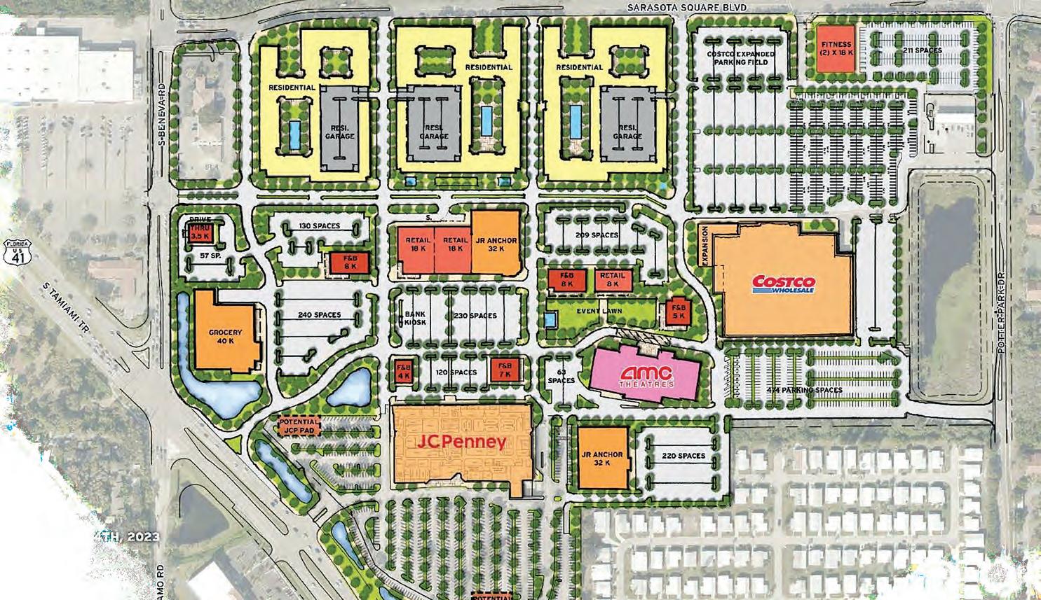 Sarasota Square is a Development of Regional Impact approved in 1974, shortly before the popularity of indoor malls reached its peak and accounted for a massive amount of retail sales. The DRI comprised approximately 91 acres and was entitled for up to 1,002,983 square feet of commercial uses.