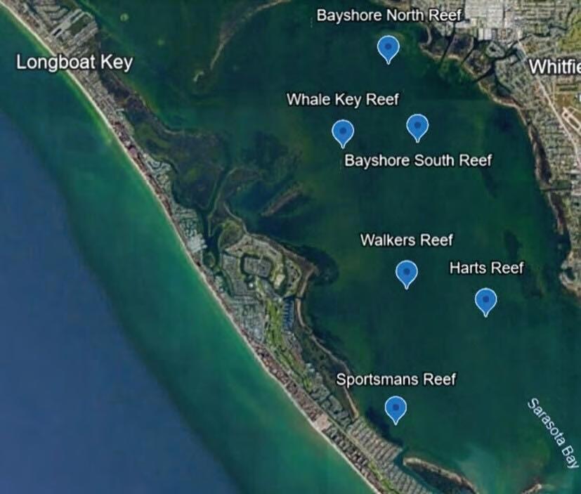 The six sites in Sarasota Bay will be Bayshore North Reef, Whale Key