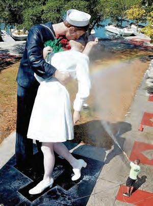 The Unconditional Surrender statue is such a popular photo spot that during its annual cleaning April 25, the Gorilla Kleen crew had to set up a perimeter so team members could clean the statue without soaking onlookers.