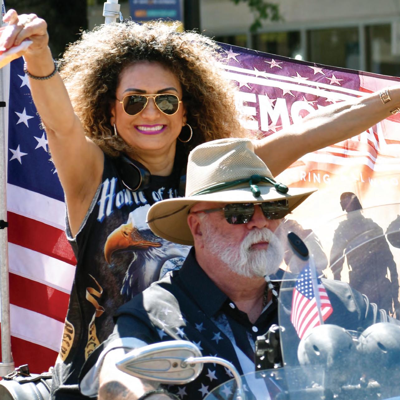 Liliana William and Miguel Gomez participate in the Memorial Day Parade on a motorcycle.