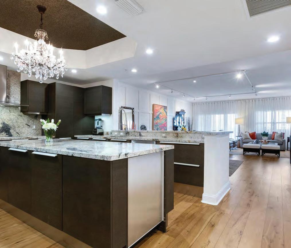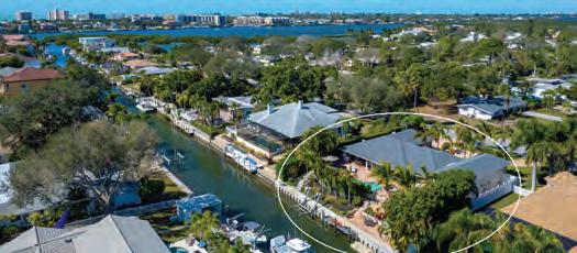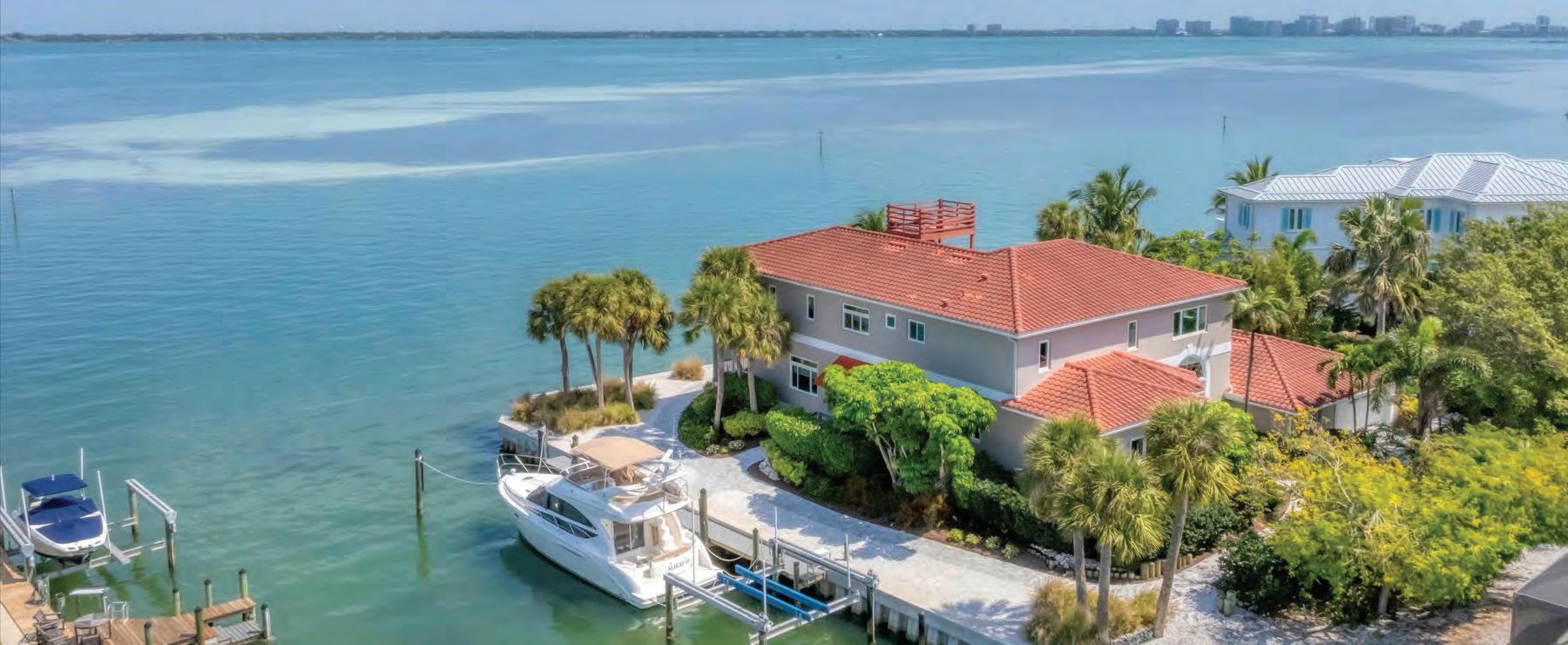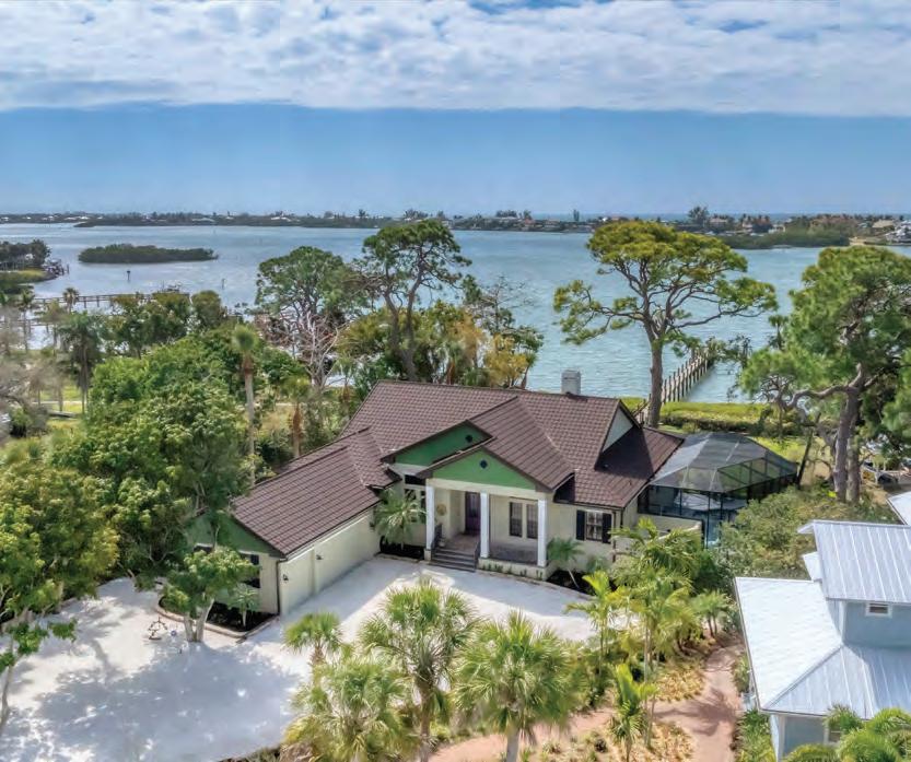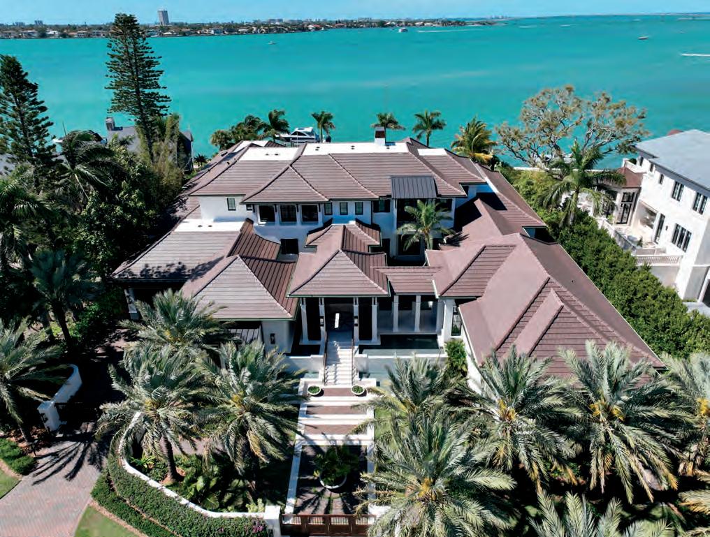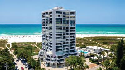 feet of patios with stunning views of Sarasota Bay, the city lights, and the Gulf of Mexico. The kitchen features top-tier appliances, a spacious island, and a wet bar for entertaining. The master bedroom offers a tranquil retreat with a designer-tiled bathroom and access to the lanai.