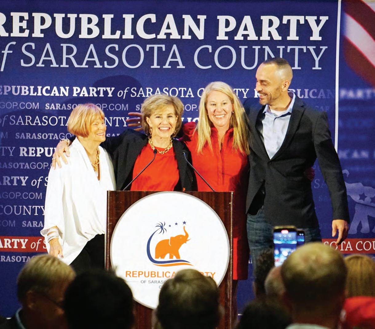 Republican Party of Sarasota County Chairman Jack Brill introduced four Republican Hospital Board winners. From left: Sharon Wetzler DePeters, Pam Beitlich, Sarah Lodge and Kevin Cooper.
