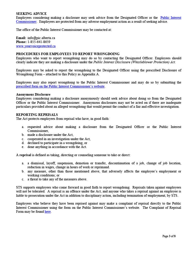 If a report of wrongdoing is submitted directly to the Commissioner, named under Alberta's Public Interest Disclosure (Whistleblower Protection) Act, the Designated Officer and STS will exert every effort to assist the Commissioner's office in reviewing the report and bringing the matter to a reasonable and just conclusion.