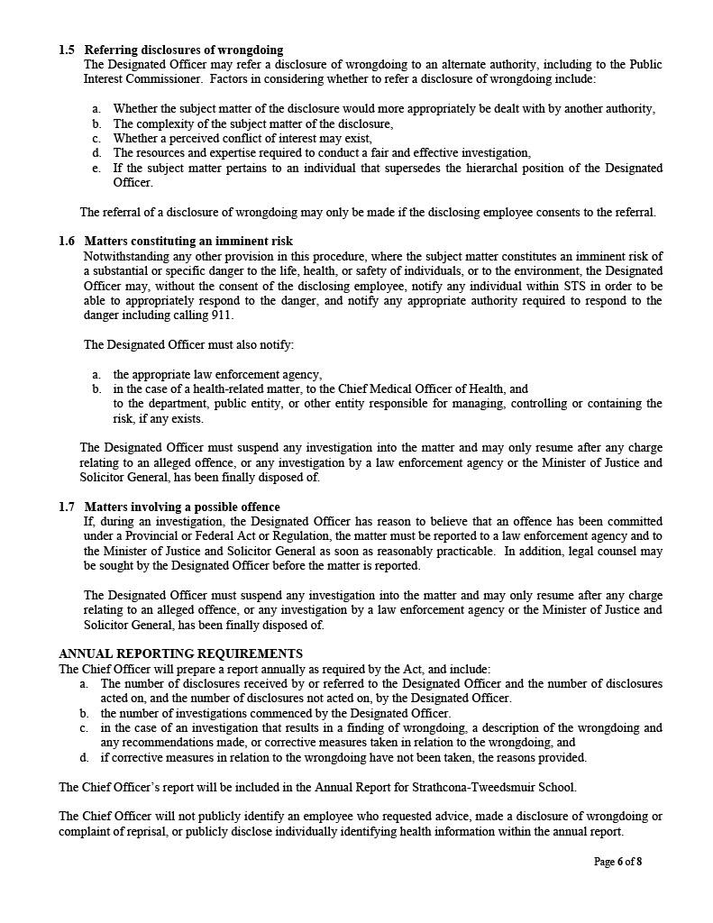 Teachers and other employees may report any wrongdoing to the Designated Officer to address the matter in accordance with the principles of due process and fundamental justice. If the report pertains to the Designated Officer, the individual should report directly to the Commissioner.