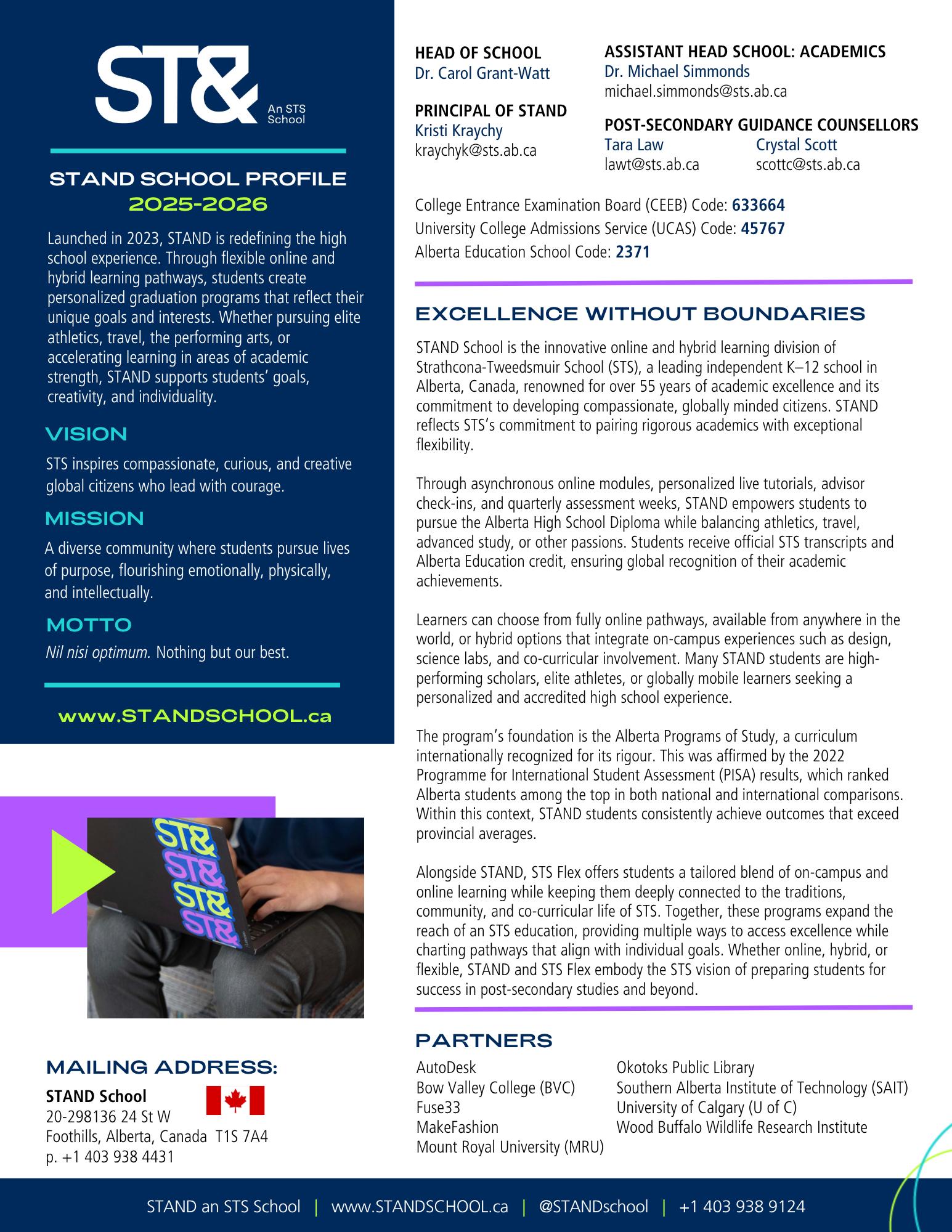 Launched in 2023, STS’s STAND School, is Alberta’s first and only independent school with Collegiate status, operates within the authority and reflects our commitment to innovative and flexible learning pathways. STAND’s hybrid, modular program allows students with significant extracurricular commitments such as elite athletes and performers to personalize their learning while maintaining high academic standards. Its placement within the K–12 authority strengthens the diversity of learning experiences available to students and demonstrates STS’s leadership in responsive education design.