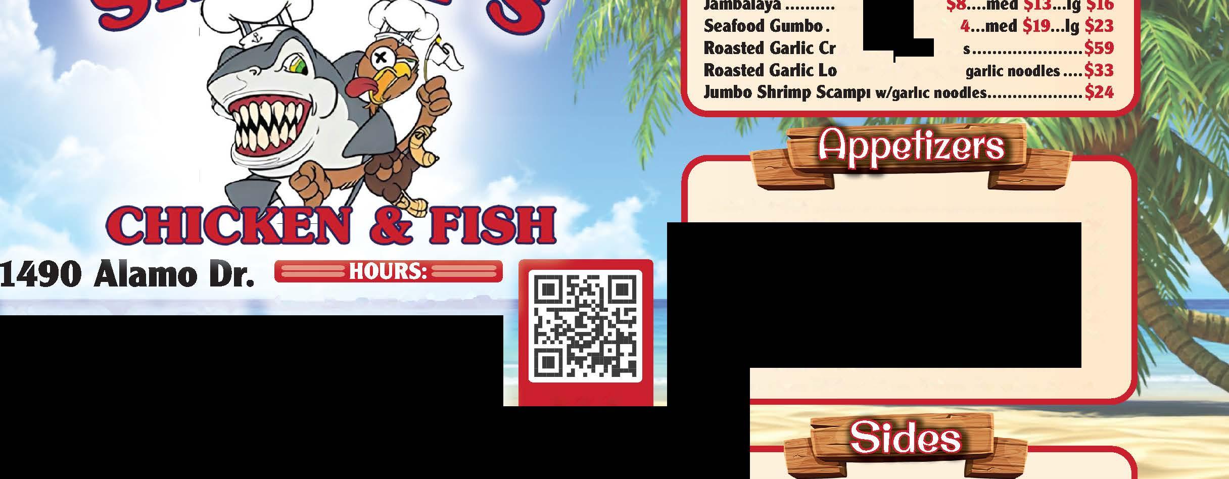 Vacaville • CA Sun-Thurs lOAM-lOPM Fri & Sat lOAM-UPM SharkysChickenandFish.com Scan to View our Full Menu! 707.514.7577o (@0······················ . : ":lt"�3 Wings, 3 Legs,: : ,i 3 Thighs • : / Chicken Combo Includes2�ides sz4 Plus and a2hter of soda for Tax •�r� 15 Piece � FishCombo lncl�des S49 Plus 2 sides Tax······················ . • ":lf:"� 5 Wings, 5 Legs,: "'. 5 Thighs • Chicken Combo lncludes2�ides s34 Plus and a2hter of soda for Tax •�r� � 20pcHotWings, AnyFlavor Includes 1 Medium Side s39Plus Tax ................sm ................sm$1 ab w/garlic noodle bsterTail (8oz) w/ . . FriedPickles.................................................$7 FrenchFries/GarlicFries...........................$7/$8 HushPuppies................................................$7 OnionRings $7 Okra.............................................................$7 Zucchini........................................................$7 CheeseSticks(6pc)........................................$7 $10 Plates (+tax) Served with fries. Choose from Chicken, Bossa, Catfish Nugget, or Po Boy. Macaroni & Cheese...........................................$6 CollardGreens.................................................$6 RedBeans & Rice $7 PotatoSalad.....................................................$6 ColeslawSlaw..................................................$6 Grits................................................................$7 CatfishFillet 2pc$14 3pc$17 4pc$20 AlaskanCod.............2pc$15....3pc$18...4pc$21 RedSnapperFillet....2pc$13....3pc$16...4pc$19 CrabCakes...............................3pc$15...4pc$18 JumboShrimp........................8pc$16...13pc$25 CatfishNuggets..........................Sm$15...Lg$19 Legs/ Tenders c$14/6pc$18I lOp s.......ZOpc$43/30p sauces..6c 11/10 ii, Z hot links, 6jumbo ..............................