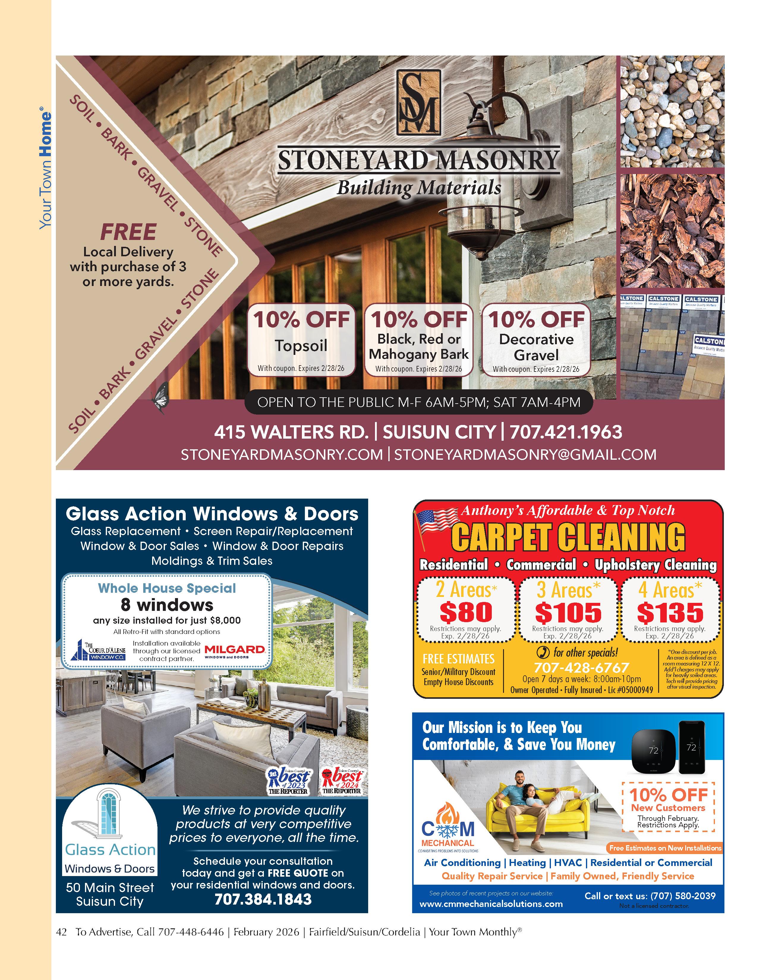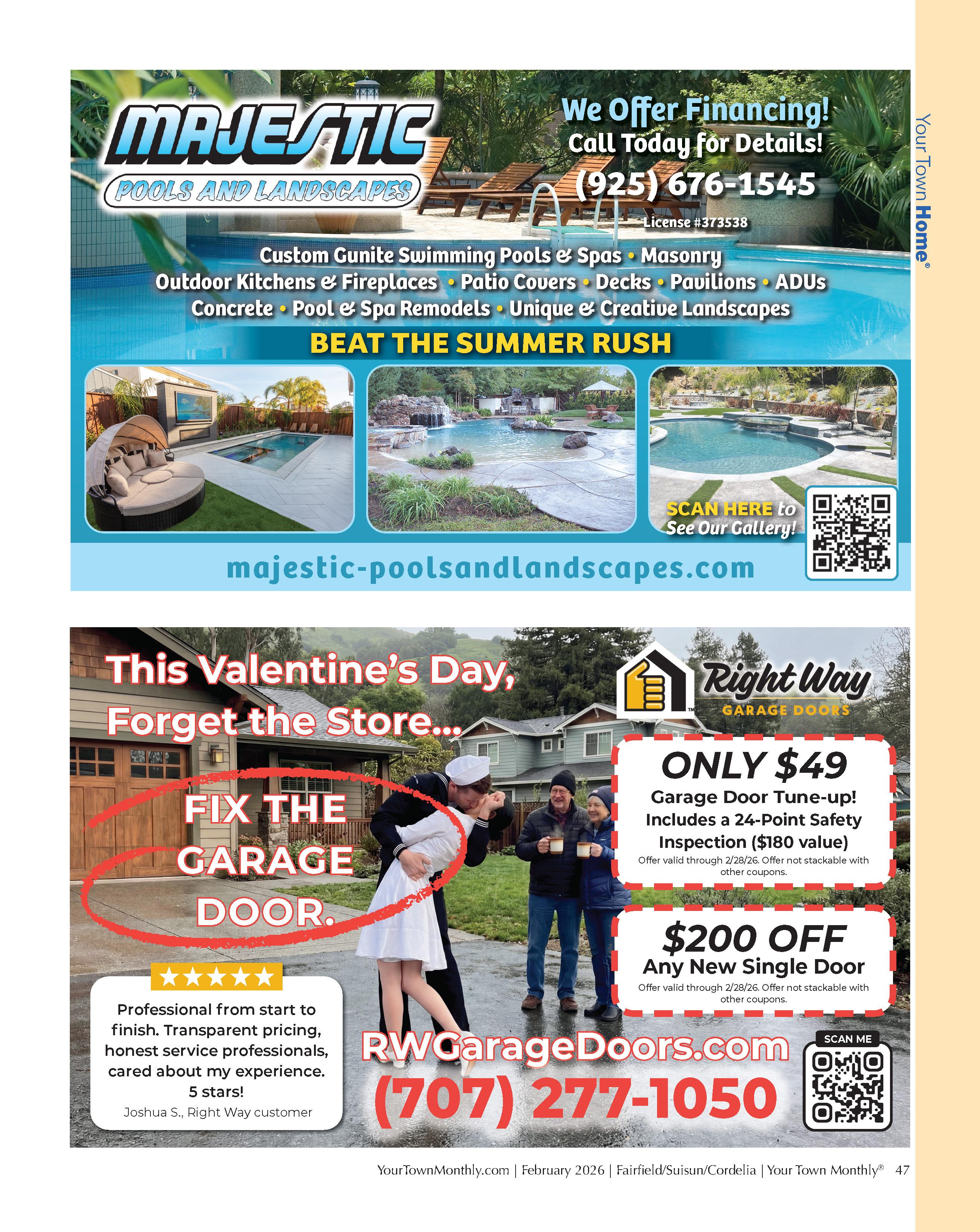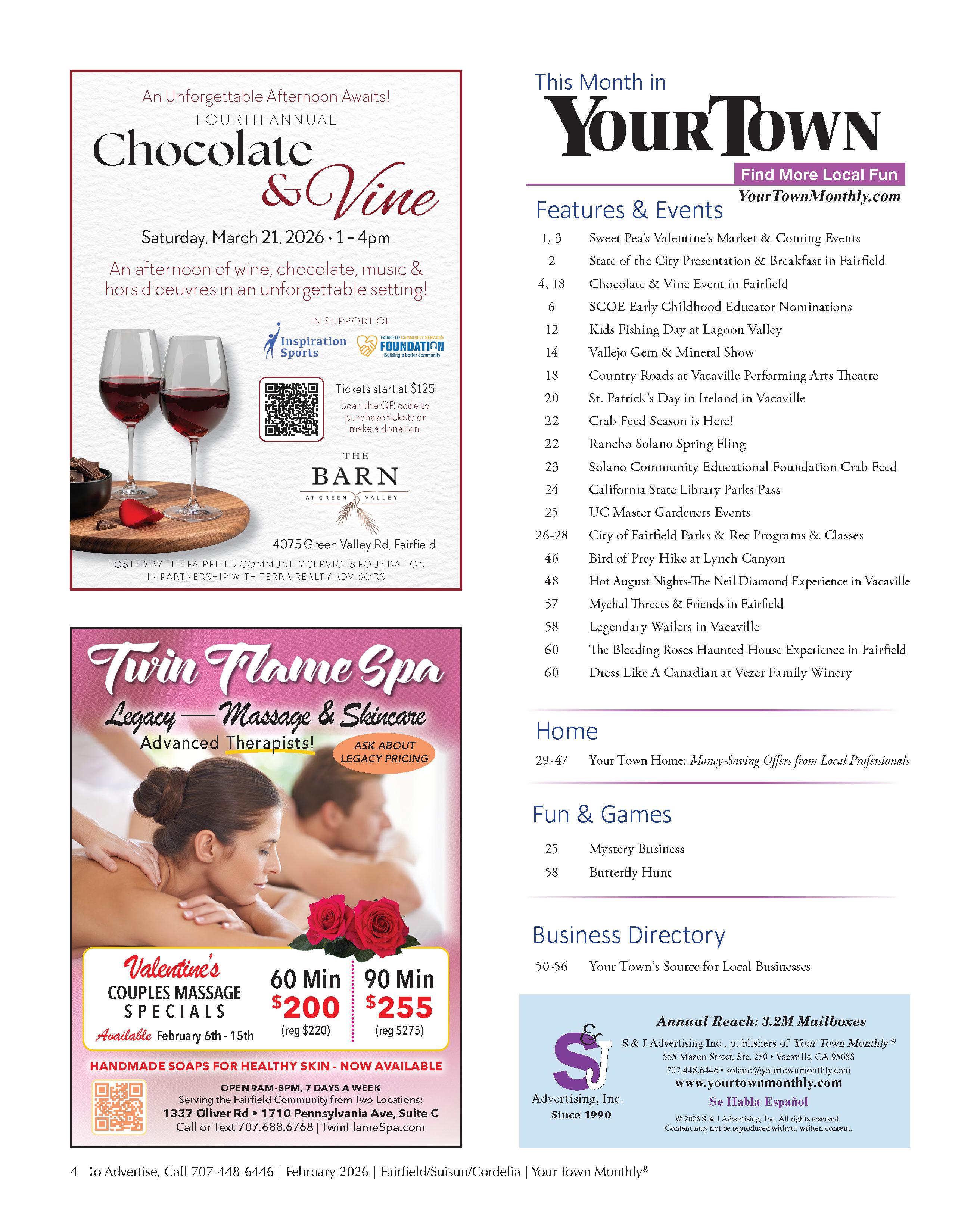 With 8 unique local editions, Your Town Monthly® is the premier direct mail magazine from the East San Francisco Bay Area to the West Sacramento Valley. Over 3.2 million are distributed to mailboxes in the Tri-Valley, Diablo Valley, Solano County and surrounding areas every year.