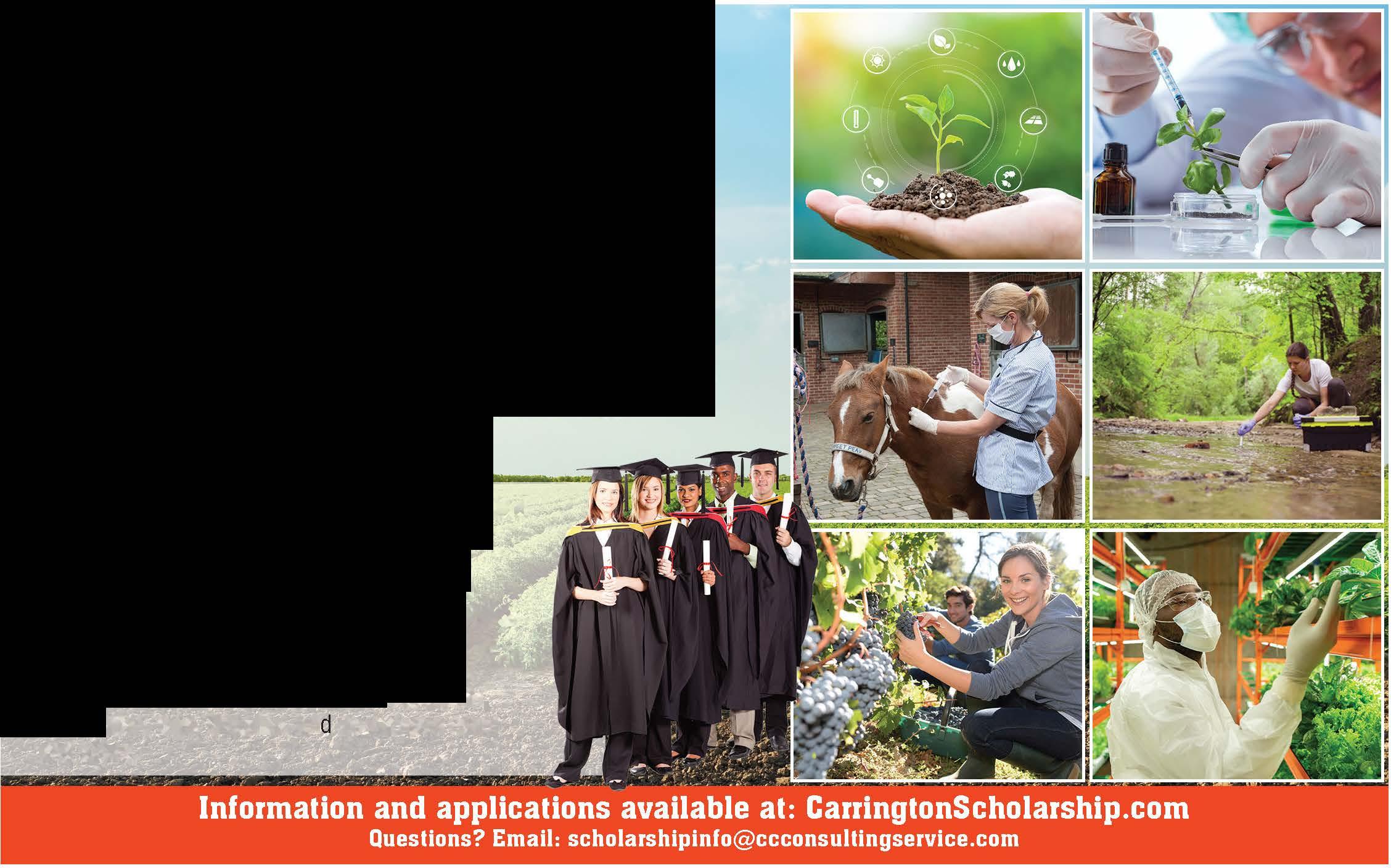 The agriculture field is very broad, and is not limited to farming. It includes a variety of fields such as animalsciences, biotechnology, foodscience, sustainable agriculture, viticulture, and wildlife conservation. A list of possible fields is included 0n thewebsite. Scholarships can be applied for year round. Funds are paiddirectly to the University for educational expenses such as books, tuition, registration, fees, supplies, an on-campus room and board.