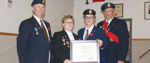 JOYCE RADCLIFFE HONOURED: President Greg Wilson, Vice-President Kim Walker and Sergeant-at-Arms Doug Jones of the Royal Canadian Legion Acadia #208 presented Joyce Radcliffe with a Lifetime Membership recognizing 55 years of membership and participation. Bugler Joyce began playing Last Post and Reveille in the Remembrance Day Services at the age of 12.