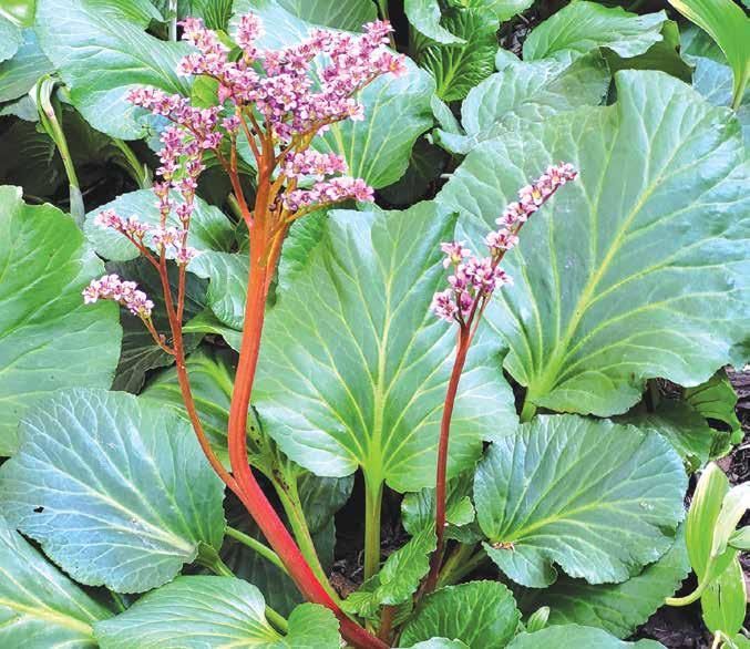 Bergenia (Bergenia cordifolia) has large handsome leaves that turn a reddish bronze in the fall. Clusters of rosy-pink flowers are produced in early spring. Native to Siberia, it’s very adaptable and will grow in sun or shade. It’s a useful plant for rock gardens, the edge of a pond, edging, or the front of a perennial border. Easily propagated by division.