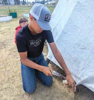 On June 18th OPS’s outdoor classroom became a hive of activity as Grade 3-6 students enthusiastically took part in two traditional tipi raisings. We were so lucky that Mr. Cory Schiebelbein from Eagle Butte High School shared his expertise with us about Indigenous ways, and led us through the steps to ensure it was properly erected. The students were amazed at how the initial tripod was made and hoisted, and how sturdy it was. Tying the canvas to one pole and then lifting it proved to be a very efficient way to get the cover into the correct place.