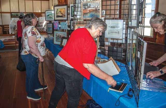 Studio 9-41 Art Display in the church at Crossroads Museum: from left, Shirley Parks looks at Kyna Fischbuch’s paintings. Centre, Catherine Holland works on her display with a partial of one of her paintings (spring thaw). PHOTOS BY TRACY HUDSON