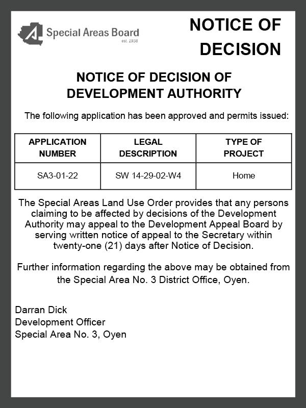 The Town of Oyen Land Use Bylaw 826-13 provides that any person(s) claiming to be affected by a decision of the Development Officer or the Municipal Planning Commission may appeal to the Development Appeal Board by serving written notice of appeal to the Development Officer within 21 days.