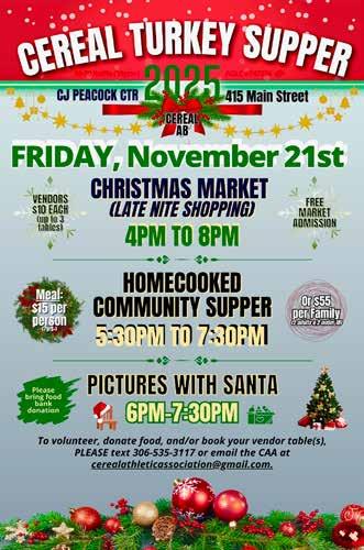 • Cereal Turkey Supper & Christmas Market. Market 4:00-8:00 PM. Supper 5:30-7:30 PM. Visit from Santa 6:007:30 PM. All at the CJ Peacock Centre.