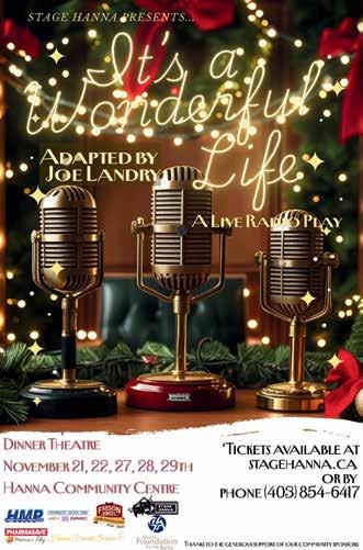 Warm, nostalgic and full of heart, “it’s a Wonderful Life: A Live Radio Play is the perfect way to kick off the holiday season with family and friends. Don’t miss this charming retelling of the movie you know and love – complete with festive spirit, community magic and a reminder that no one is ever truly alone. Dinner Theatre tickets are available for purchase online at www.stagehanna.ca/wonderful-life/ or at Main Street Barber in Hanna. Catering provided by Trina Hernden catering. Show dates are November 21, 22 and November 27, 28 and November 29, 2025.