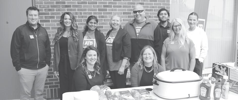 ATB celebrates 53rd Birthday for Oyen Branch Thursday, September 18, 2025: One hundred plus people shared in the celebration at the picnic tables located on the parking lot, enjoying hot dogs, chips, refreshments and birthday cake in the sunshine. (L-R): Will Beliveau - Business RM, Daina Wilson - Everyday Banking Spec, Hina Vasani - CSR, Karrie Derouin - CSR, Kirk Mack - Agriculture RM, Sunny Rawat - Business Advisor, Sheri Kiemele - Business Advisor, Tara Lutz - Marketing Manager. Front Row: Sam Kuhn - Branch Manager, Jenna Bingeman - Personal Banking Spec. PHOTO BY DIANA WALKER