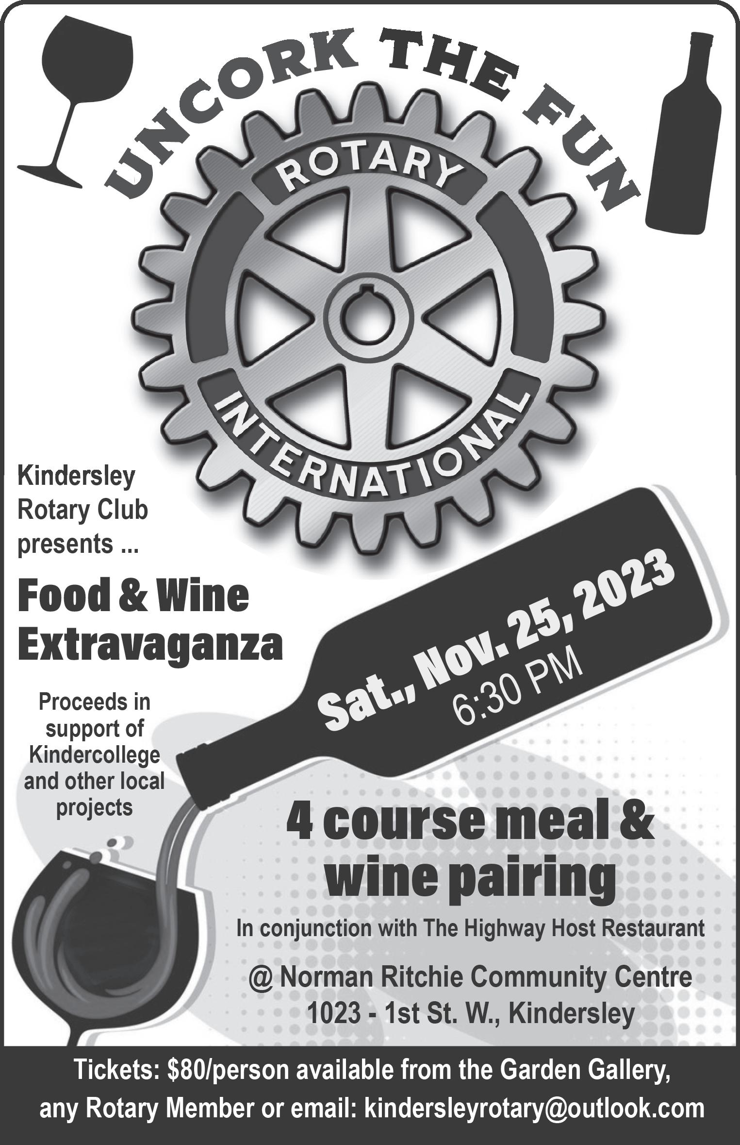 • The Kindersley Rotary Club is hosting ‘Uncork the Fun’ - a Food and Wine Extravaganza 6:30 PM at the Norman Ritchie Community Centre.4 course meal and wine pairing. Tickets $80 and are available at the Garden Gallery, from any Rotary member or by email at kindersleyrotary@outlook.com. Proceeds in support of Kindercollege and other local projects.