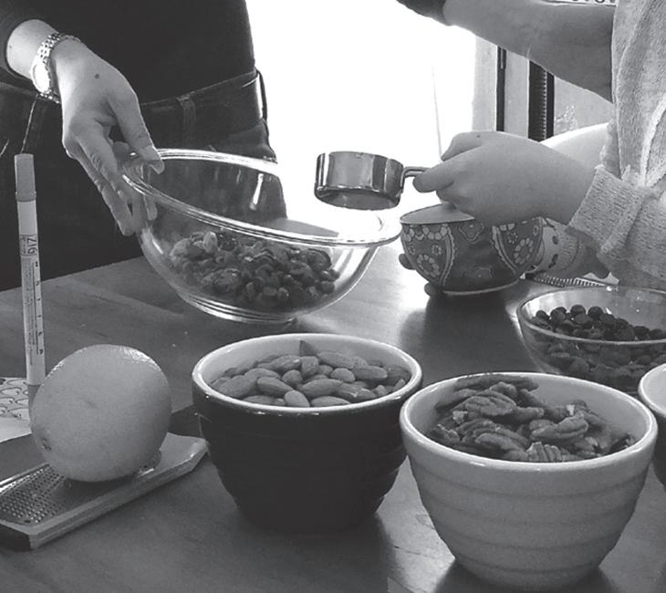 “Mom’s recipes are secret!” Eloise whispers to me as I nibble on Cayenne Spice, an irresistible spicy mixture of walnuts, cashews and pecans. But Tasya willingly shares another seasoned nut recipe that her family makes — one that combines well with dried cranberries and chocolate chips for a Valentine’s Day snack mix that families can make and gift to others during this time of year.