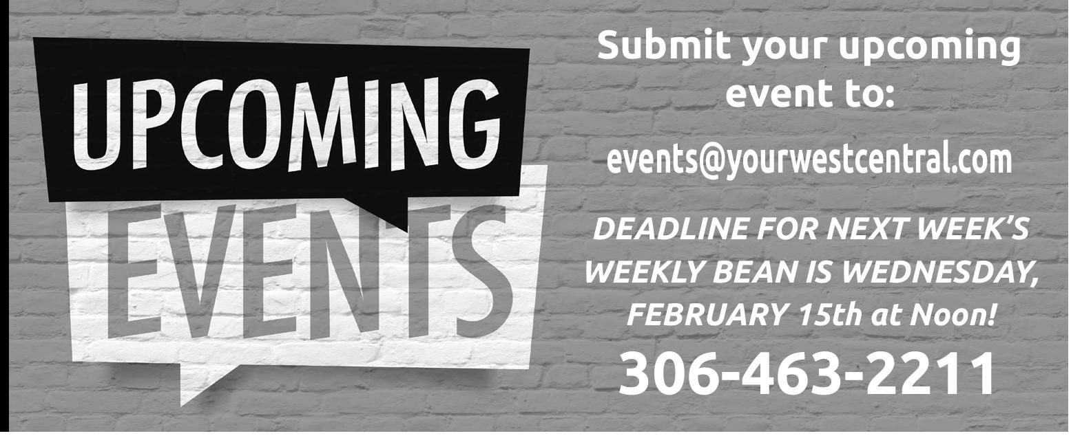 • Kindersley Curling Club Men’s Bonspiel. Entry fee: $280/team. Saturday night Steak Supper included with registration. To register, contact Richard at 306-460-6258 or sign up at the curling rink.