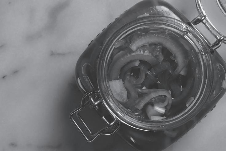 If you’d like to add flavors to your onions, you could add whole black peppercorns, jalapenos, red pepper flakes, whole garlic cloves, fresh herbs, fresh ginger or bay leaves. What can you do with pickled onions? You put a tangle on a taco, a bunch on a burger, a smattering on a salad, a heap on your hummus, a pile on a pizza, a knot on your nachos or an assemblage on a sandwich. You can also chop pickled onion in a food processor with sour cream or mayonnaise to make a quick dip or sandwich spread. Make a chilled appetizer serving onions massed on top of softened cream cheese with crackers for a summer barbecue, and a jar of quick pickles always makes a lovely hostess gift. With summer in full swing, you’re never more than 15 minutes away from crisp, cool, take-allthe-credit pickled onions. I hope you agree, that’s a pickle you don’t mind being in.