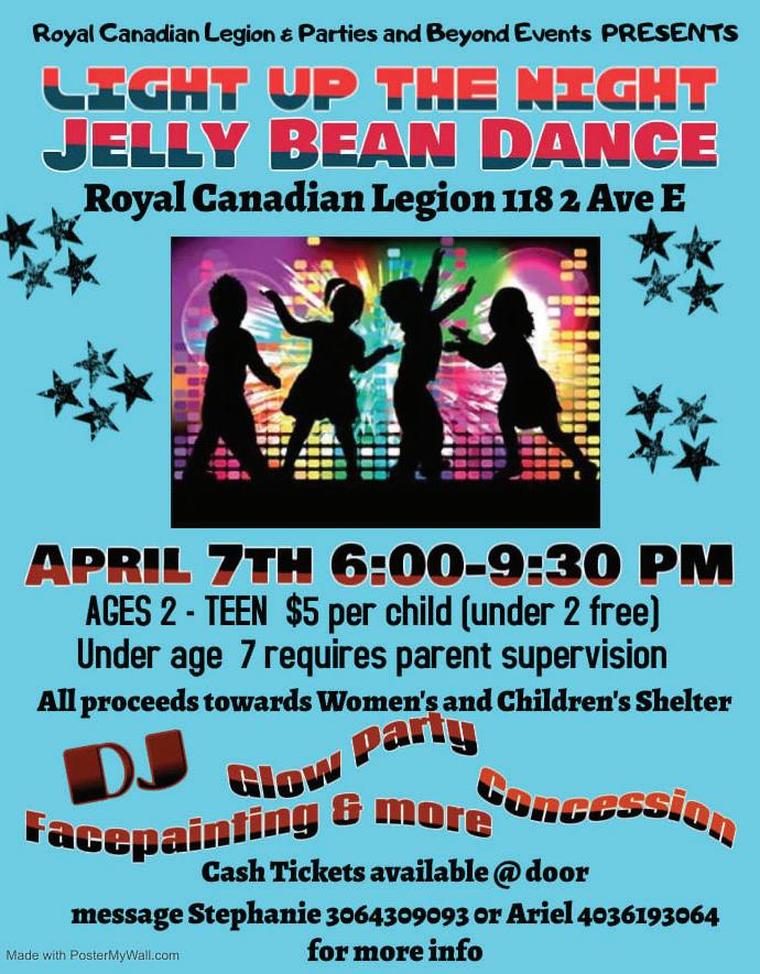 • Light Up The Night “Jelly Bean Dance” at the Royal Canadian Legion 6:00-9:30 PM. Ages 2 - Teen. $5 per child (under 2 free). Under 7 requires parent supervision. All proceeds towards Women’s and Children’s Shelter. Message Stephanie 306-430-9093 for more info.
