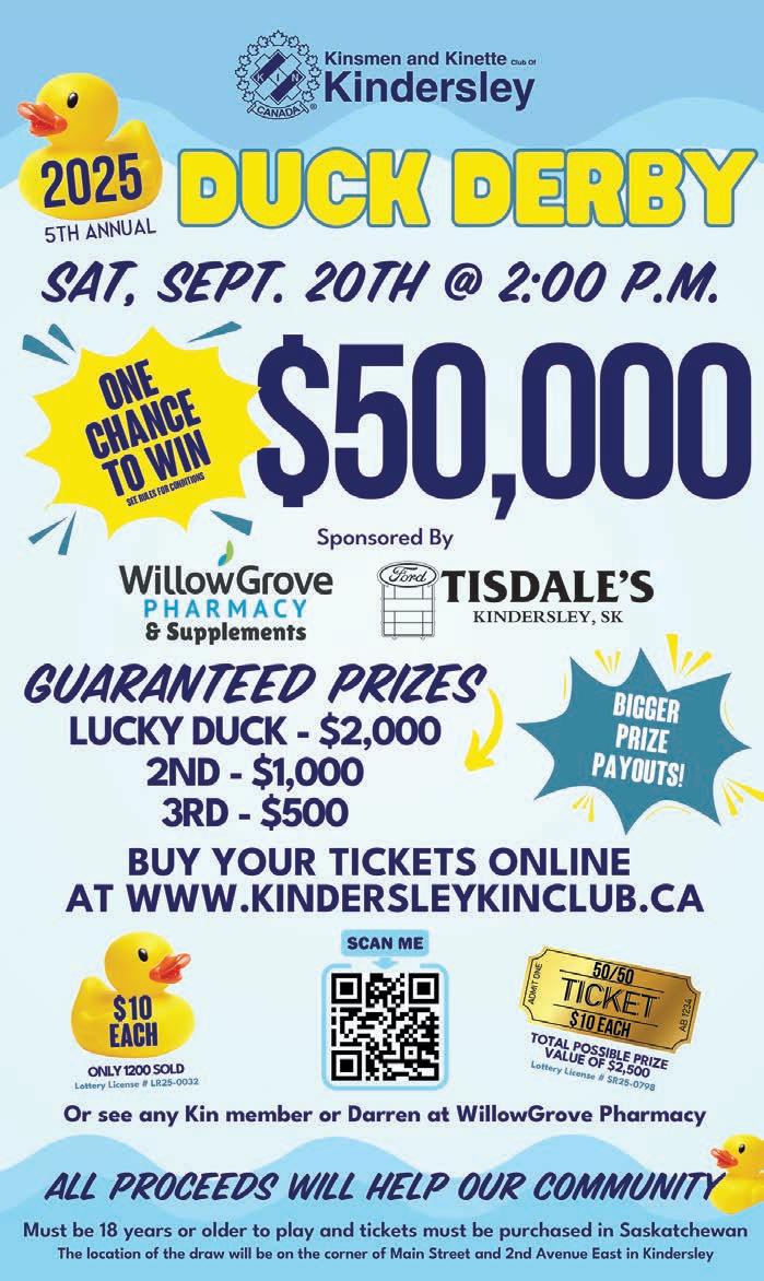 • Kinsmen and Kinette Club of Kindersley 5th Annual Duck Derby 2:00 PM on the corner of Main Street and 2nd Avenue East. Get your tickets NOW at https://www.rafflebox.ca/ raffle/kkck or any Kin member or Darren at Willowgrove Pharmacy for tickets. $10 each. Only 1200 sold.