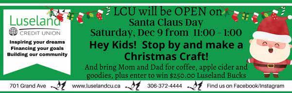 • Santa Claus Day in Luseland. Christmas Craft events, photos with Santa, Christmas Movie for the Kids at 2:30 PM. Giant Bonfire at the toboggan hill 4:00-6:00 PM. Carolina around town 6:00 PM. Carol Sing at Alliance Church 7:00 PM.