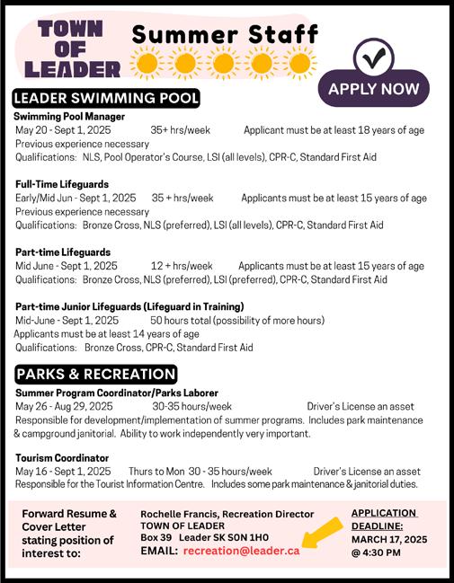 • Leader Open Bonspiel. $200 entry. Cash Prizes! To register contact John 306-628-7901 or Krista 306-587-7379