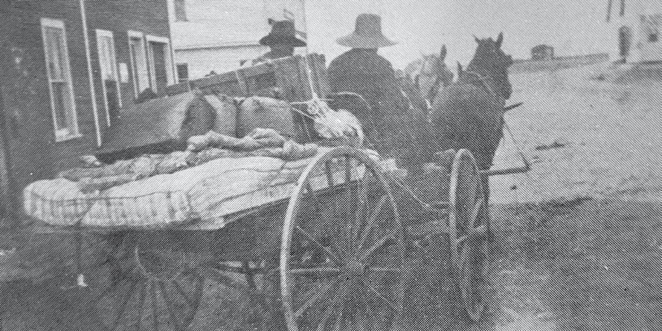 WHEN HOMESTEADERS HEADED TO THEIR CLAIMS NEAR MANTARIO: William Nash’s outfit leaving Kindersley for the homestead in the Mantario area. They were accompanied by Mrs. Jas Cridland.