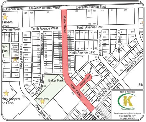The Town of Kindersley is pleased to announce that we will be undertaking a watermain replacement and road reconstruction project along Main Street, specifically between 7th Avenue and 11th Avenue, including Philips Court. A contractor has been selected for the watermain portion of the project, and construction will commence later this spring.