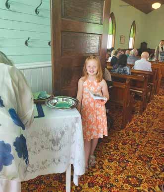 After the service concluded, everyone went to the community hall for a program and potluck supper. Shania Sanville sang a solo, and Frances Swan from Eatonia read a poem she had written. Her father-inlaw, Ed Swan, was one of the board members when the church was built in 1925, and her son Bryan and great-granddaughter Brodie had the honour of cutting the anniversary cake. A beautiful 100th anniversary plaque was made and donated by Randy and Connie Schmidt in honour of this special occasion.
