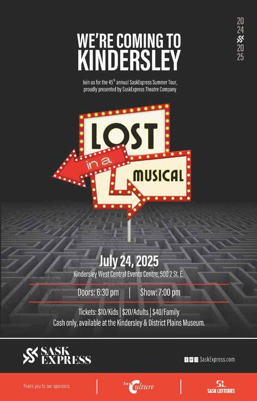 • Sask Express presents Lost in a Musical at the WCEC. Doors open 6:30 PM. Show at 7:00 PM. Tickets: $10/Kids; $20/Adults; $40/family. Cash only. Available at the Kindersley & District Plains Museum.