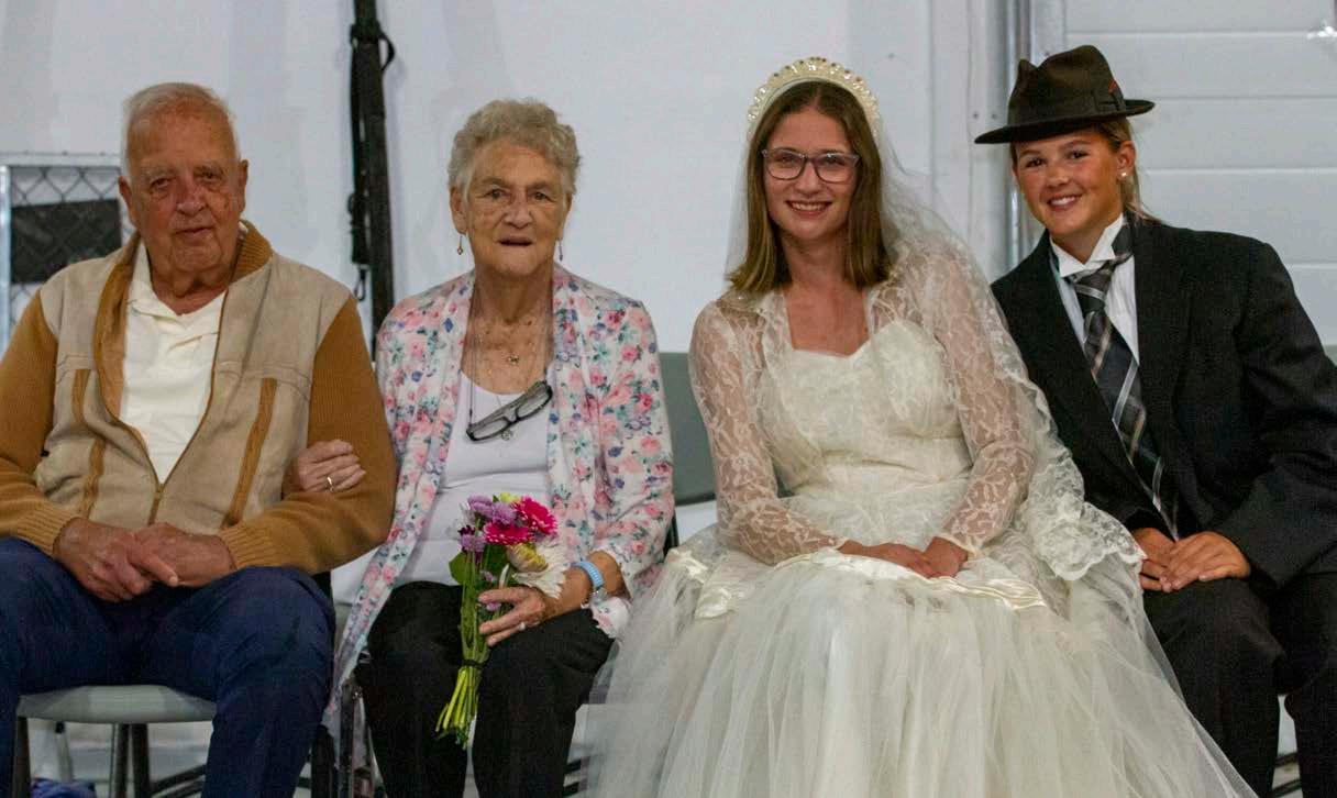 1800s to the 1980s. The tux and dress worn by Emily Polsfut and Shelby Rublee were donated by the vice-chairman of the museum Glen Sitter and his wife Lorraine Sitter who are celebrating their 65 wedding anniversary next month. (L-R): Glen Sitter, Lorraine Sitter, Emily Polsfut, Shelby Rublee. | PHOTO BY ANNIE DUNCAN