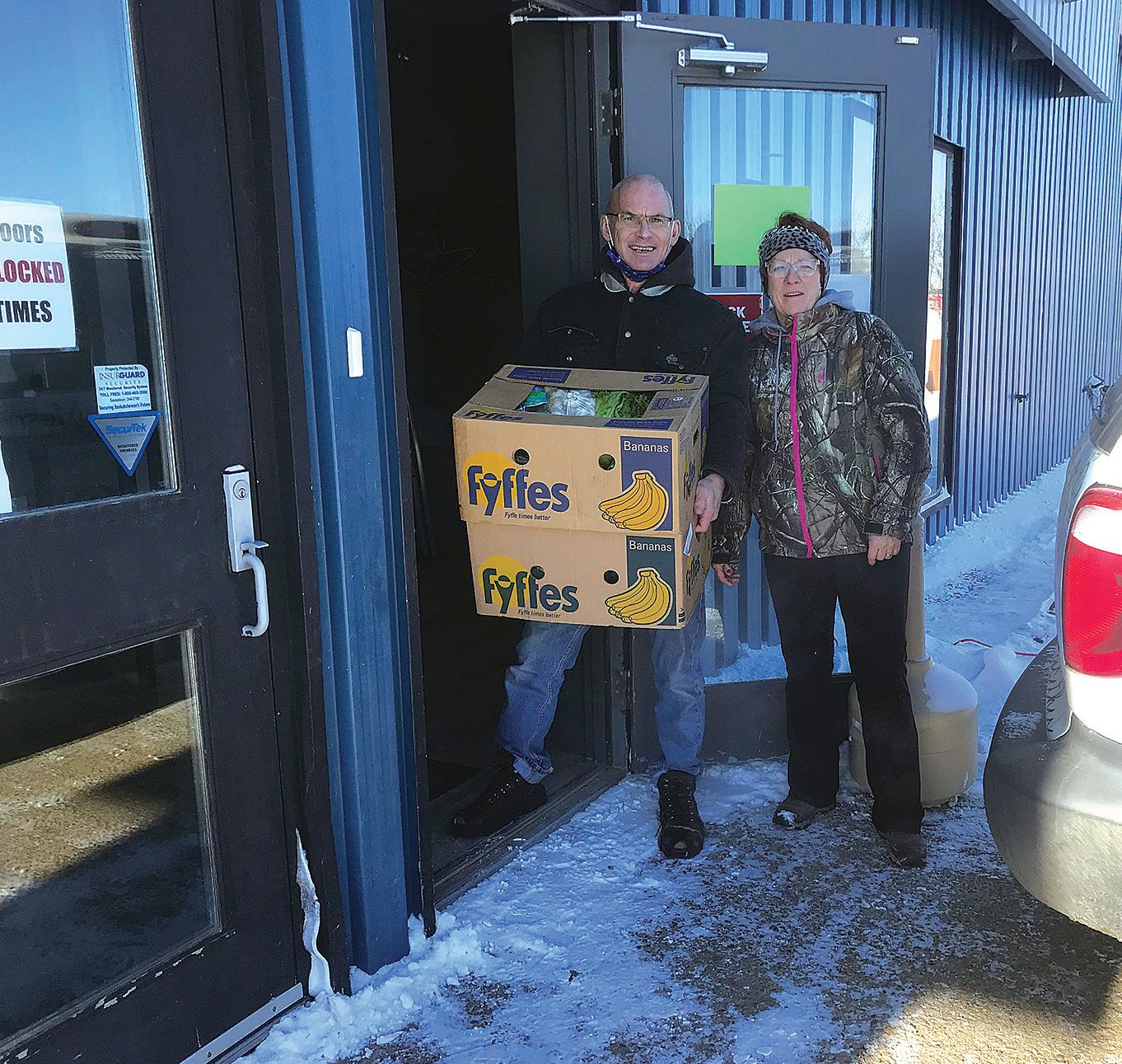 Volunteers, Chester Dobni and Barbe Dunn, deliver food donations from Buy-Low Foods to the Kindersley Christian Fellowship building. | PHOTO BY JOAN JANZEN