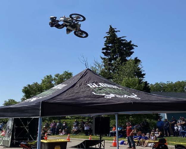 Two Canadian champions from Manitoba and British Columbia flew through the air on motorbikes, thrilling the audience. A young motorcyclist, only eight years old, also showed the crowd his skills. They did three additional performances on Sunday afternoon.