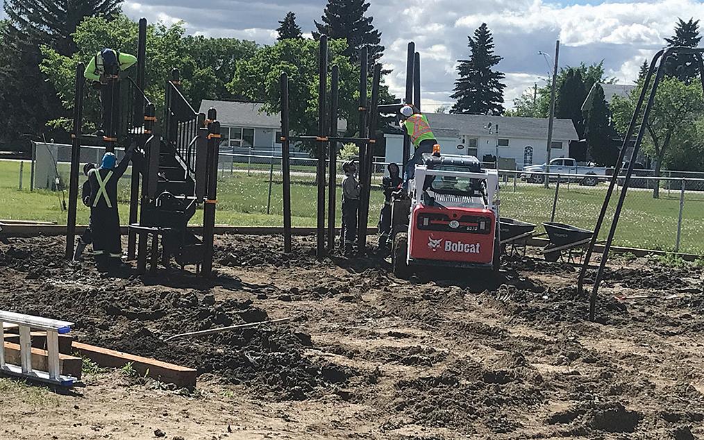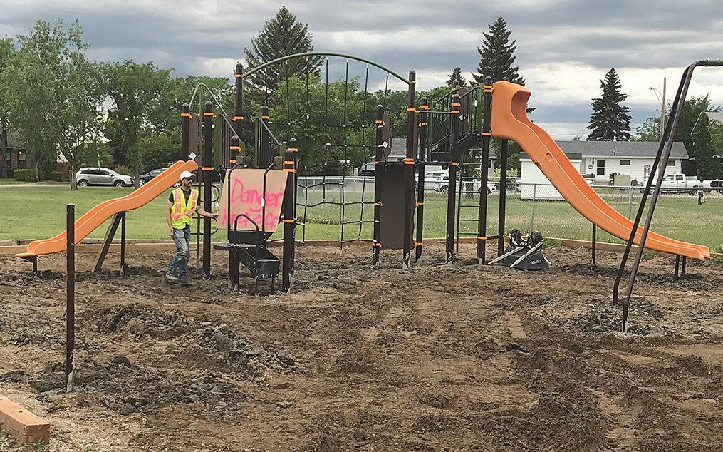 A work crew began assembling new playground equipment at Kinsmen Park in Kindersley on June 14th. Rain showers delayed their progress, but it looks like children will be able to enjoy the new playground in the next week or two.