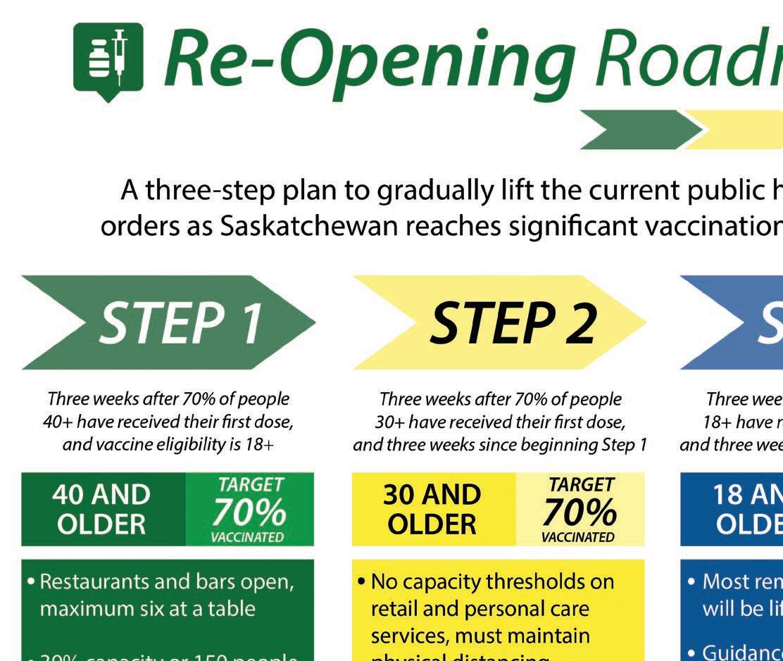 Next would come Step Two that would end limits on store capacity, dining and fully re-open barber shops and hair salons while allowing as many as 150 people in casinos, bingo halls and theatres. This will all be allowed if we can get 70 per cent of Saskatchewan residents 30 years and older vaccinated by mid- to late-June.